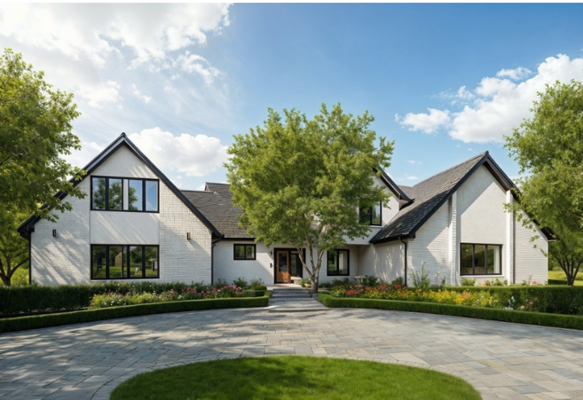 do not change anything but the following add easy landscaping to center grass section the sections of the house that appear to be stucco need to be vertical wood keep every part of the house with brick the same do not change the brick