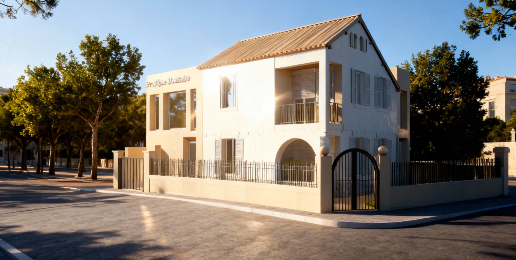 lot of reflects and sun light the sun illuminates the facade that one sees some trees and a street of marseille in the backgroung facade more in the light more reflect all is painted no stone less shadow colors more intense