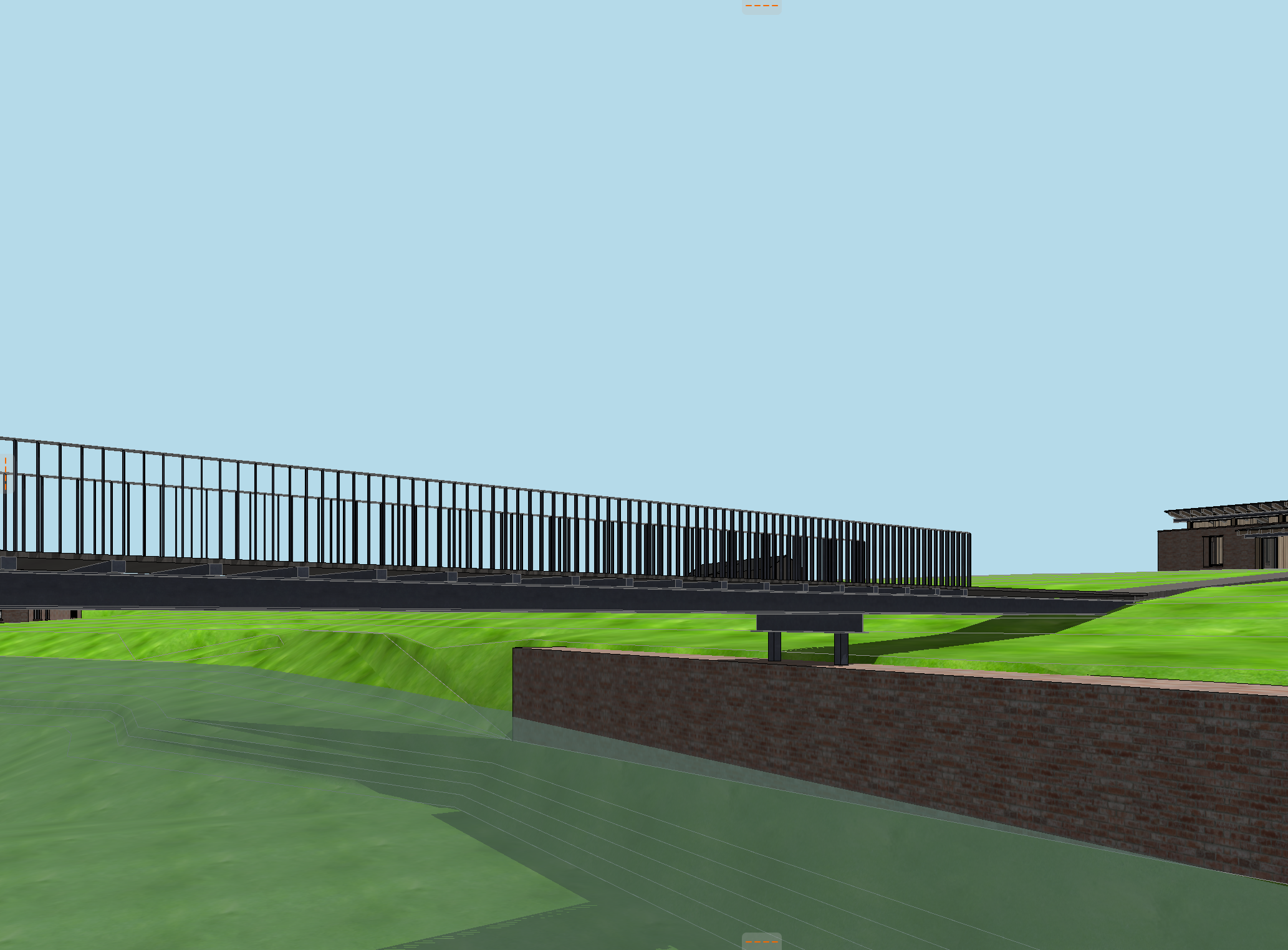 detail shot of an antique brick retaining wall with a soldier course at the top of brick walls with steel beams supporting a steel bridge landscape to be tall wild louisiana grasses and wildflowers yellow pine trees in the background clouds in the sky lake inlet in the foreground with 2 people in the water on kayaks