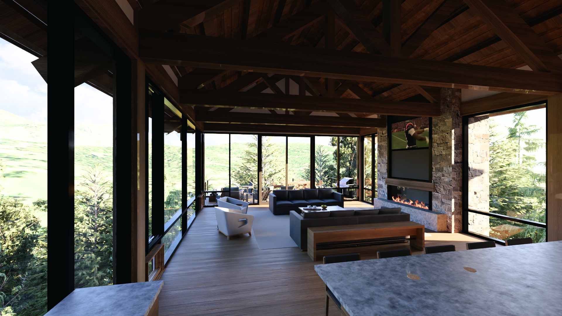 interior render a photorealistic 3d perspective of this house reference the current material style just enhance them rough sawn timber truss perlins t g ceiling stone walls keep model geometry the same windows doors roof walls keep lanscape views wintertime very snowy outside do not change the view only enhance the current materials and realistic montana vegetation background detailed textures in the wood siding and glass reflections and a vibrant clear sky with light atmospheric depth render in hyper realistic architectural visualization quality 8k