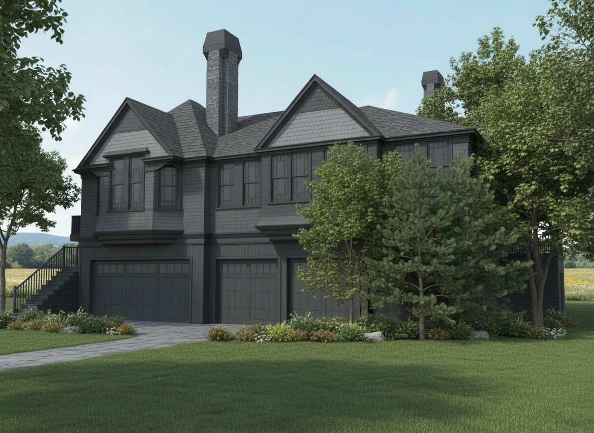 this house is in montana make wood siding ghost wood like jackson hole house add rock slab patio off front left side and wrap around left side of house create rock stairs going down to it from the house make rock slab pathway from driveway make oustide golden hour make golden light coming from inside house
