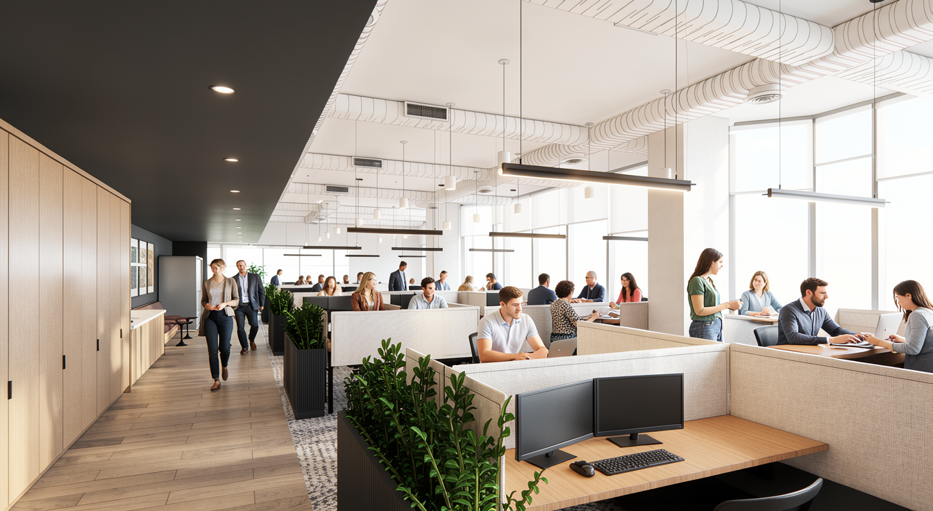 take out 50 of the people and add in a sunny downtown view from the 14th floor of a building