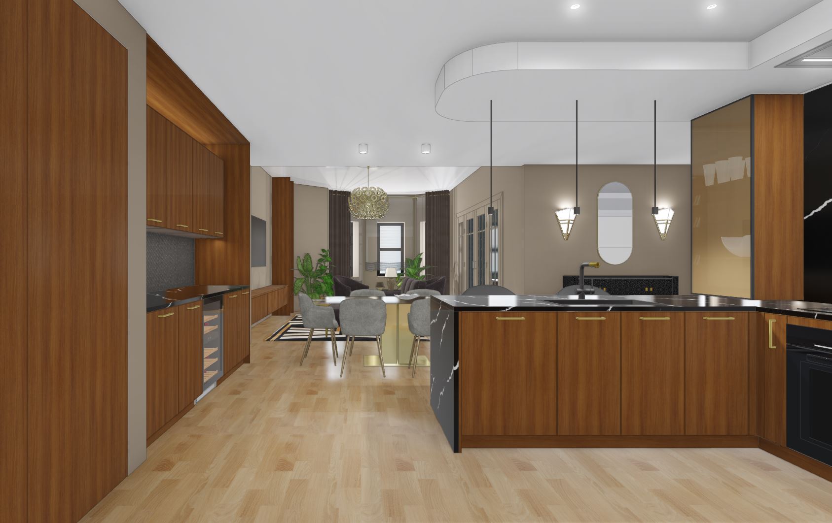 add white vase with cherry blossoms on the island moody light cabinets in matte flat doors do not change cabinets nor add open shelves don t add new cabinets don t add new windows cloudy weather light inside wall glass cabinet glass door is semi mirror bronze glass room filled with ambient light ceiling matte light inside the tall cabinet with shelves and under the floating cabinets