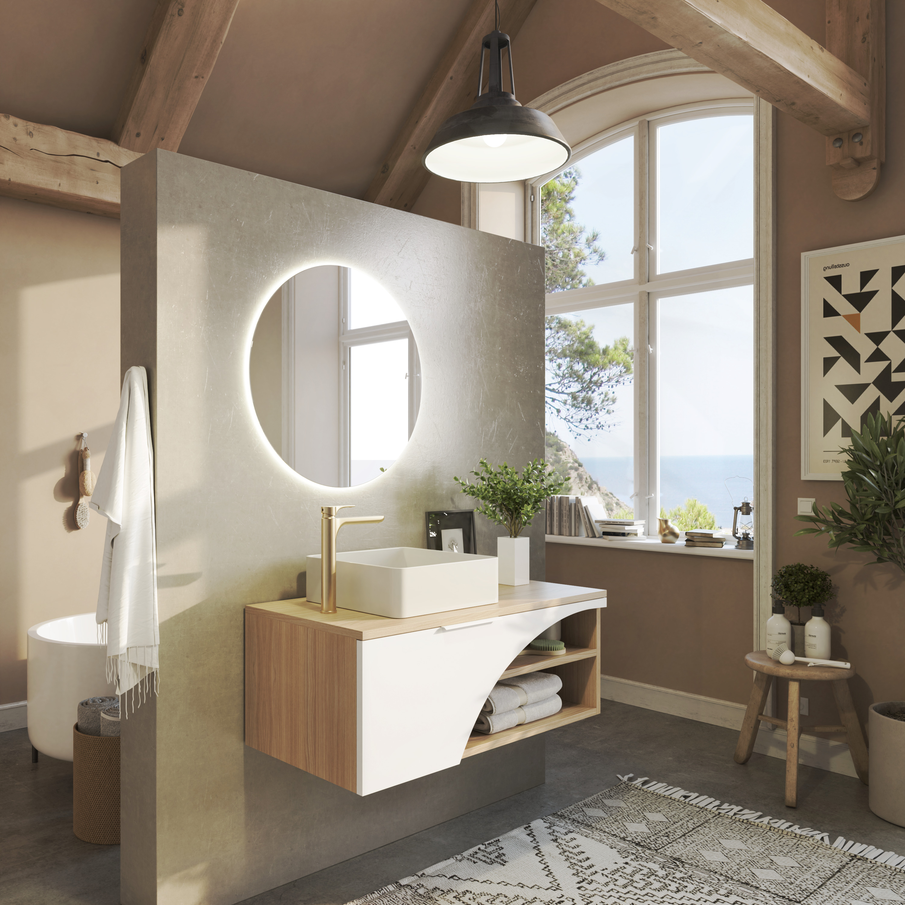 change the architecture of this scene while keeping the bathroom furniture and the mirror the scene must have a window i want it to look like a completely different room so you can change the decoration