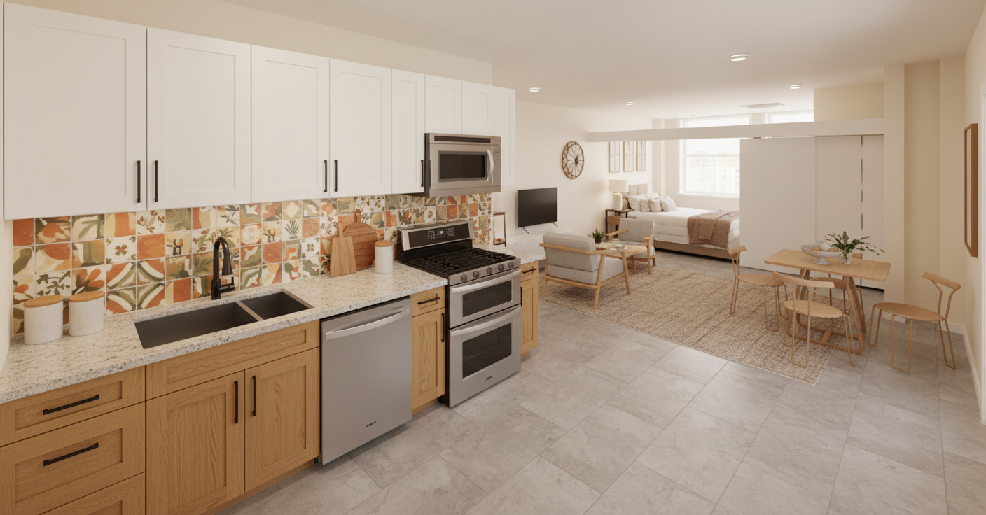 make the cabinets light blue the countertop a wooden butcher block the draws 5 piece headers and a living room through the doorway