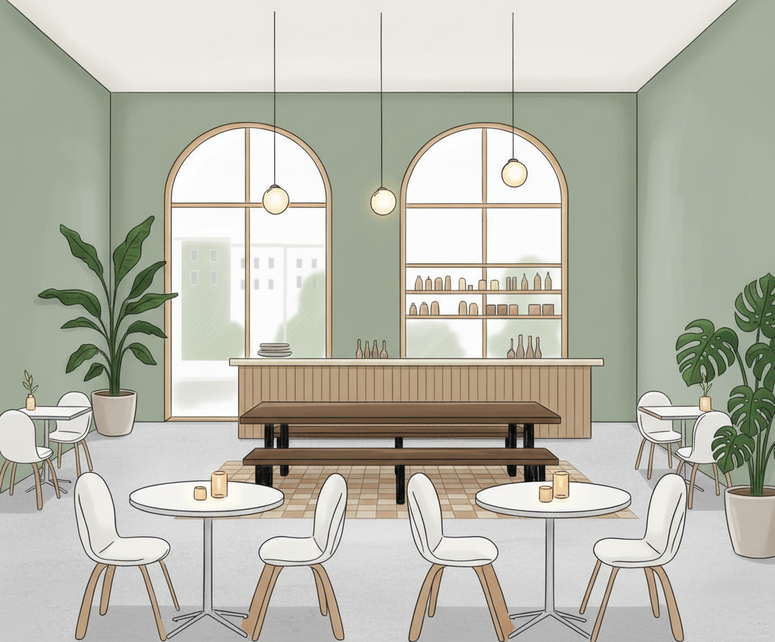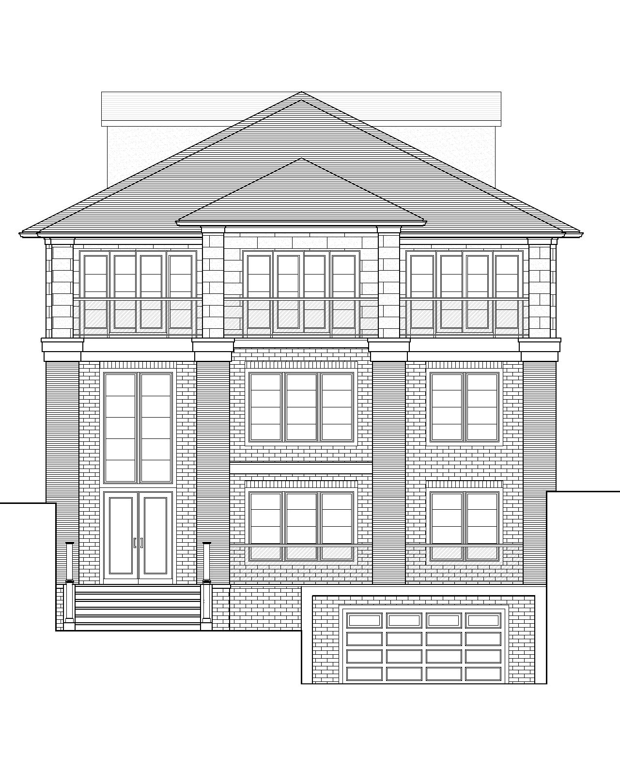 please make a realistic render with warm modern tones and black window frames set in a residential neighborhood with some large mature trees in the background keep existing material showing natural brick natural limestone dark slate roof and contemporary accents