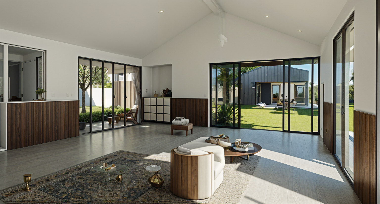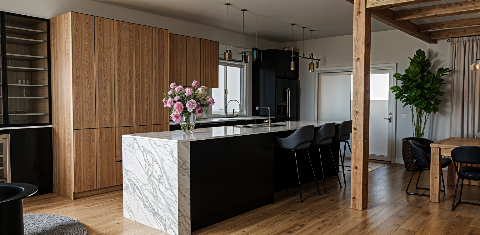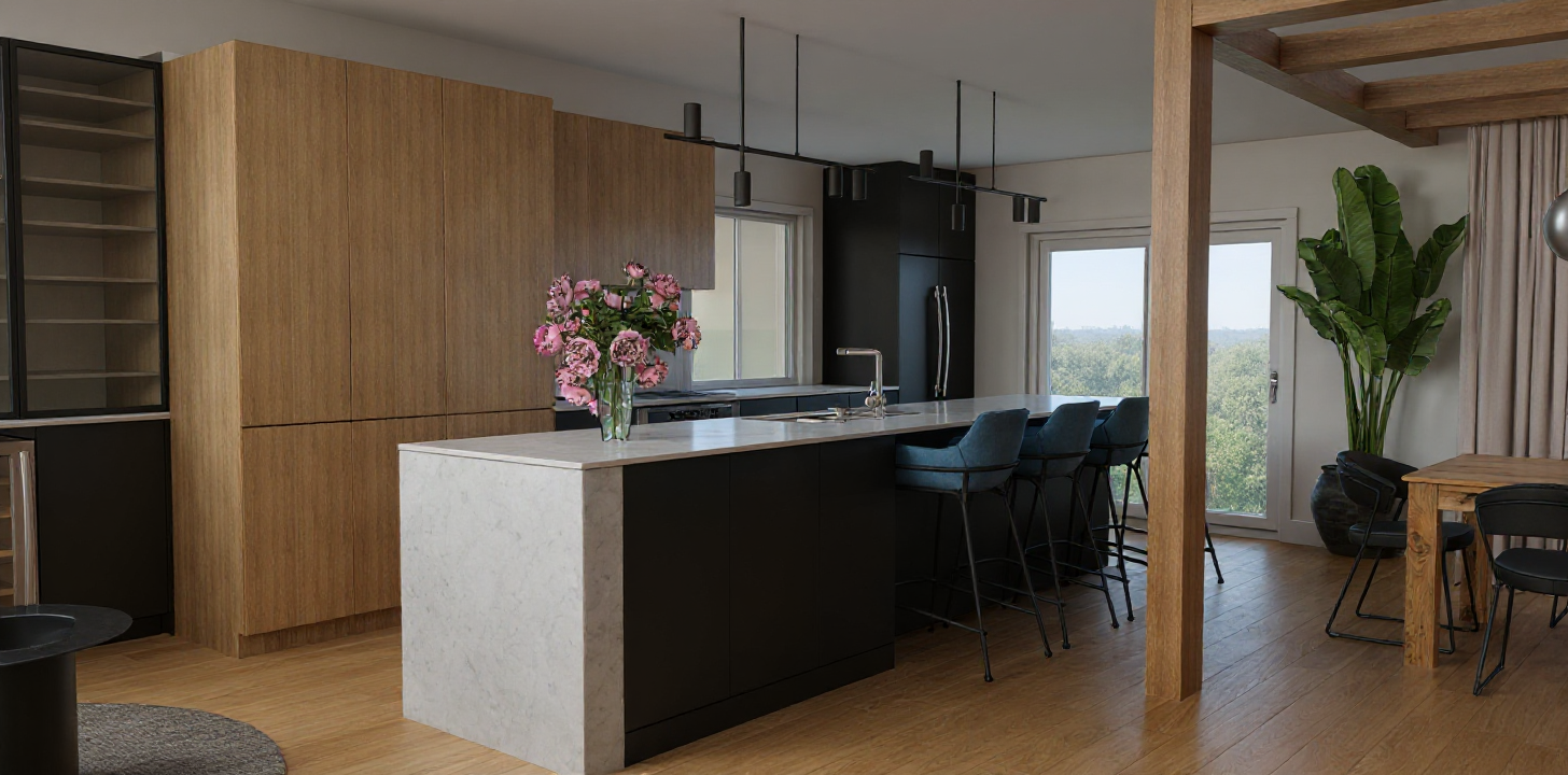 please use floorplan above to generate a rendering of a bathroom japandi inspired boho eclectic bathroom see references do not put a chandelier walnut tongue and groove ceiling detail