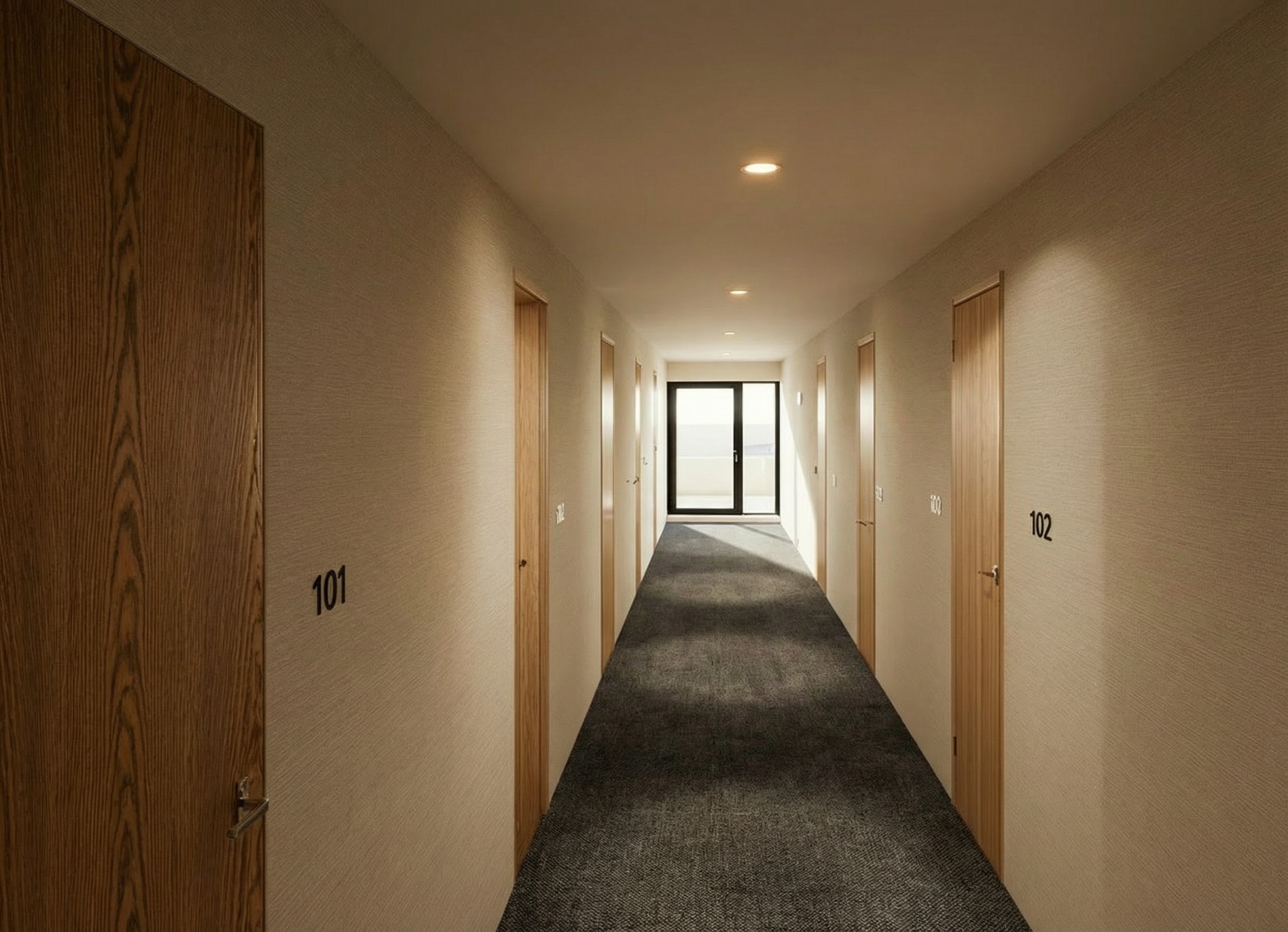 add vertical line acoustic panels on one side of hallway change door handles to be black