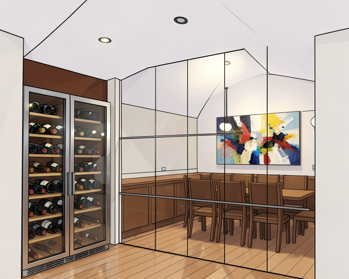cartoon sketch not glass door its a wine cooler add wall art on right wall not that wall the wall with the shelf remove shelf and add wall art instead change wall art to one large painting make it abstract painting groin vault ceiling plain white glass wall brown cabinets wine on table remove top cabinet make glass on wine cooler opaque