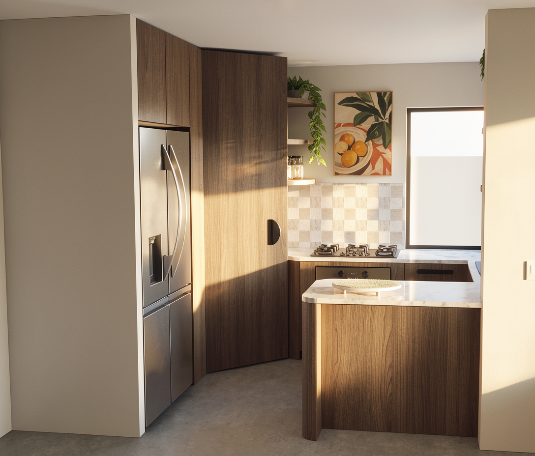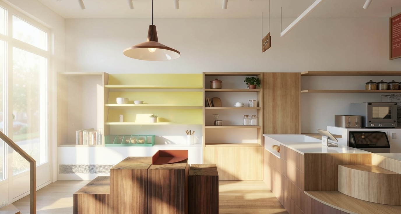 this is an interior view of a coffee shop the space has very soft natural light in it do not change anything or add anything to the structure of this image there are no windows on any of the walls in the view there are no hidden windows on any of the walls in the view soft diffuse natural light is coming from the left side of the image do not add any items to the shelving show only what is there already show light coming from the ceiling light fixtures and the long strip fixture on the upper right side show integral lighting on the wood shelving but not on the yellow shelves the shelves sre empty of objects do not put any new objects in the rendering