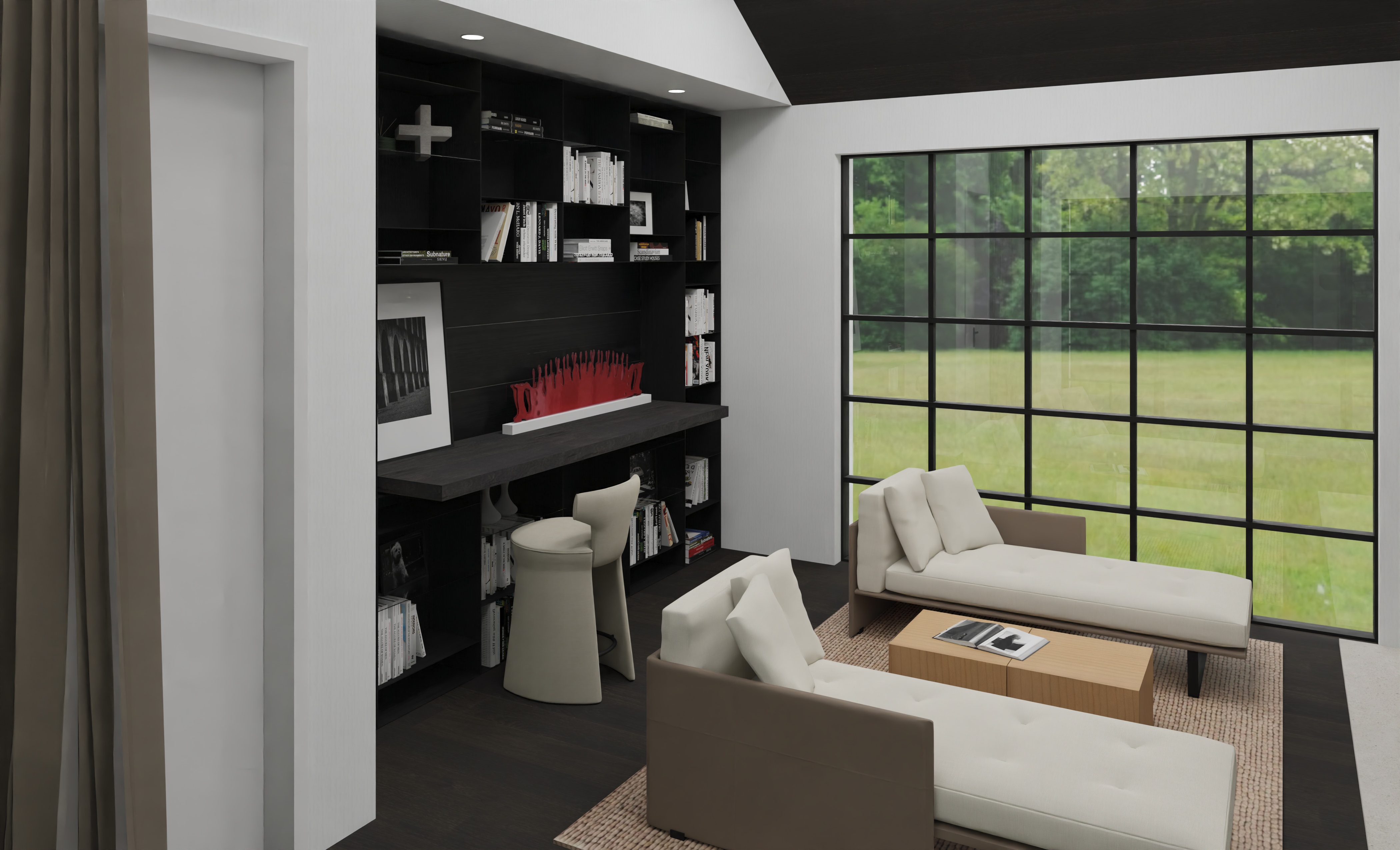 a modern minimalist library design dark oak flooring and matching ceiling complements black wood cabinet that have no lighting within them with a matt black fossil wood desk top and soft seating the design the atmosphere is calm and relaxing accented by lush green hydrangea plant outside the window with lighting that is soft and natural creating a relaxing atmosphere
