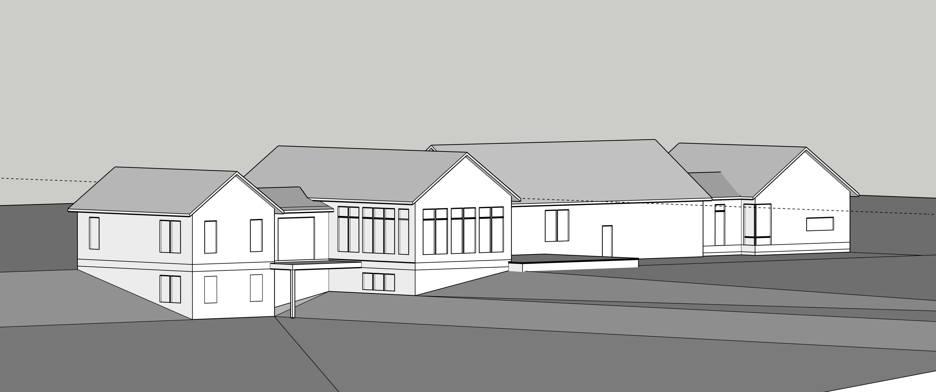 render using exact massing contemporary farmhouse with grey vertical siding stone foundation metal roof wooded setting at dusk