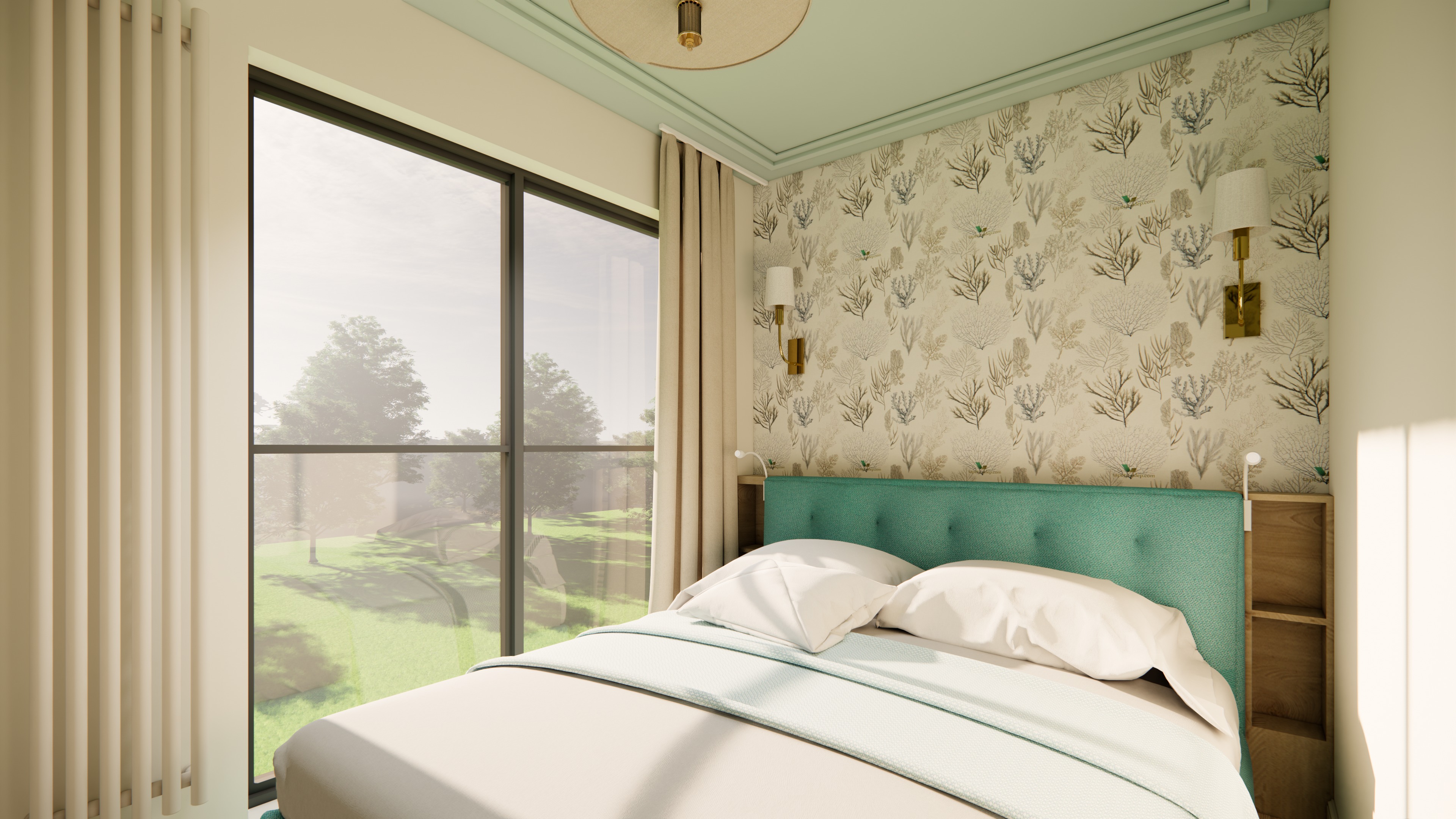 colonial revival interior shot modern minimalist living room with a built in wall unit and shelving and a small round wooden coffee table remove the sofa completely and leave the space clean and uncluttered do not change the layout of the interior or the camera perspective keep the exact same composition proportions and viewpoint change the dominant wall and cabinetry color to a warm rusty brown rich earthy terracotta rust tone extend this same color to the wall in the bedroom area where the bed is visible so that it matches the living room and creates a cohesive unified space adjust the ceiling color to a complementary warm neutral tone that harmonizes with the rusty brown e g soft warm beige or off white change the bed frame color to a coordinated tone within the same palette but clearly different from the walls e g deeper brown muted taupe or dark wood tone not the same rusty color keep the area near the window empty no side table or tall cabinet maintain a minimal aesthetic with very few decorations and clutter keep soft natural lighting neutral curtains and wooden flooring preserve the original materials ensure all reflections if any remain are fully consistent with the room subtle realistic textures high end interior design style clean and calm atmosphere architecture