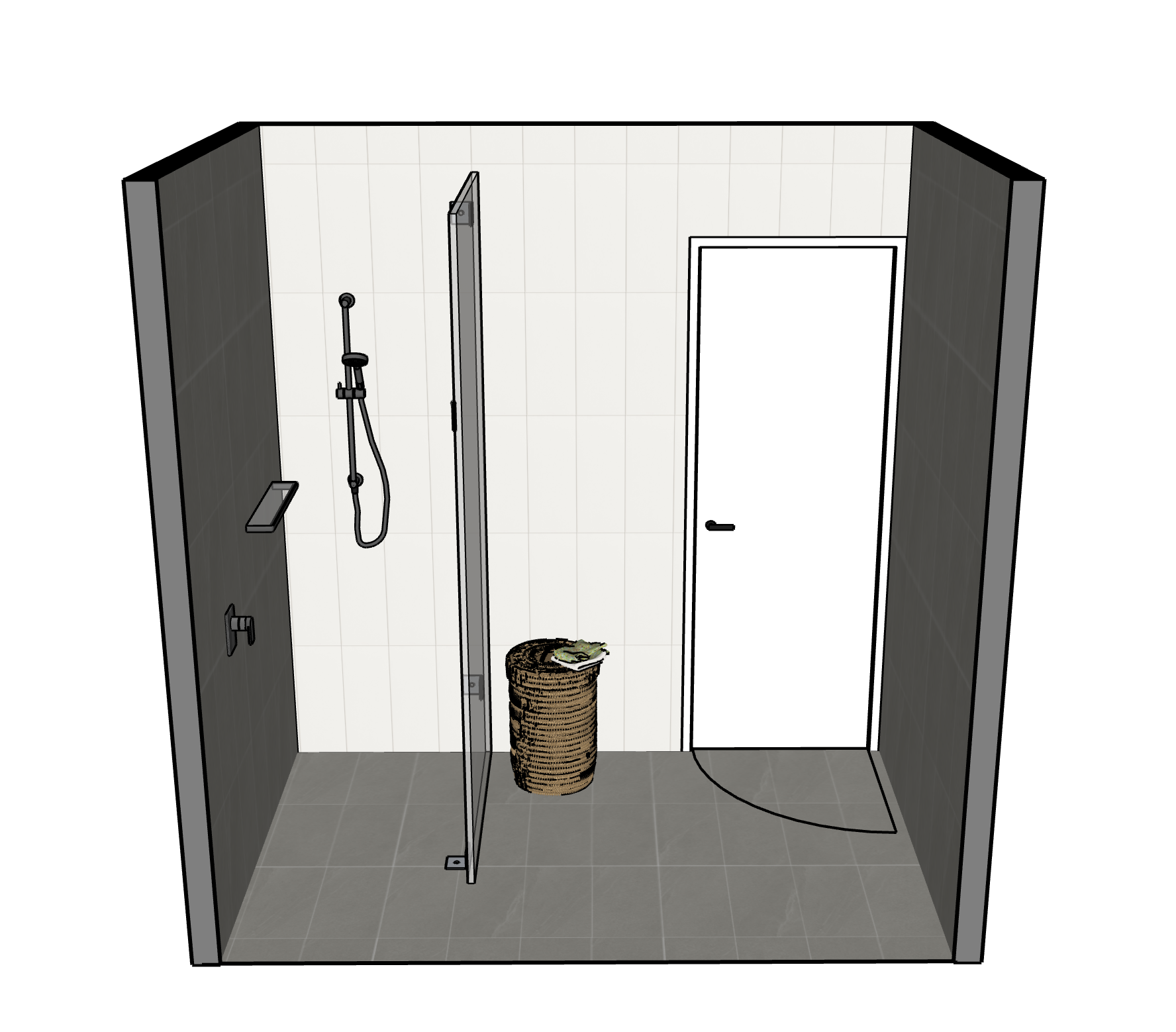 all fixtures are dark metal grey left and right walls and floor tiles are grey back wall is white tiles shower screen is glass door is white