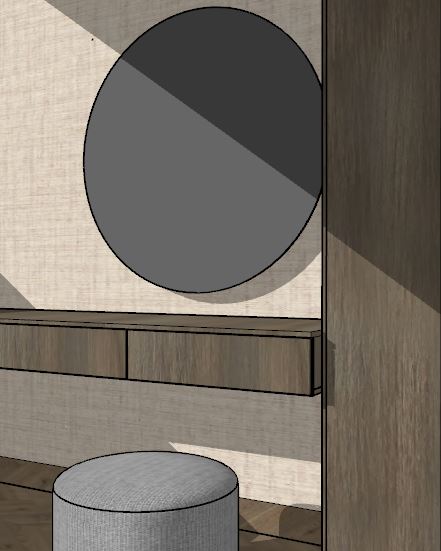 image type hyper realistic interior architectural render editorial style scene framing maintain exactly the same composition crop camera position and proportions as the reference image close up frontal view eye level neutral lens 35 50mm no distortion critical corrections very important sketch lines must be removed all visible black contour lines come from the sketch model and are not real shadows or material edges do not reproduce any outline contour or graphic edge all edges must be defined only through natural light shadow and material transitions materials consistent refined realism wardrobe wood natural wood same tone as reference soft grain slightly irregular matte with very subtle reflectivity tactile slightly rough surface no artificial contrast on edges vanity wood same material language and tone as wardrobe continuous calm natural wall textile organic textile surface fine uniform texture warm beige tone no seams or repetition artifacts mirror clean circular mirror subtle warm perimeter backlight soft halo integrated and elegant accurate reflection floor wood herringbone natural wood parquet matte soft reflectivity realistic grain pouf grey fabric matte soft volume lighting preserve original maintain the same daylight direction and shadow composition diagonal sunlight across the wall and furniture no changes in intensity or mood mirror backlight remains subtle color atmosphere warm neutral palette wood tones beige textile soft greys calm editorial refined style high end architectural interior photography minimal elegant material focused no graphic or illustrative qualities quality ultra realistic high resolution physically accurate materials pbr clean global illumination no noise no artifacts restrictions do not include outlines or sketch lines do not exaggerate textures do not oversaturate colors
