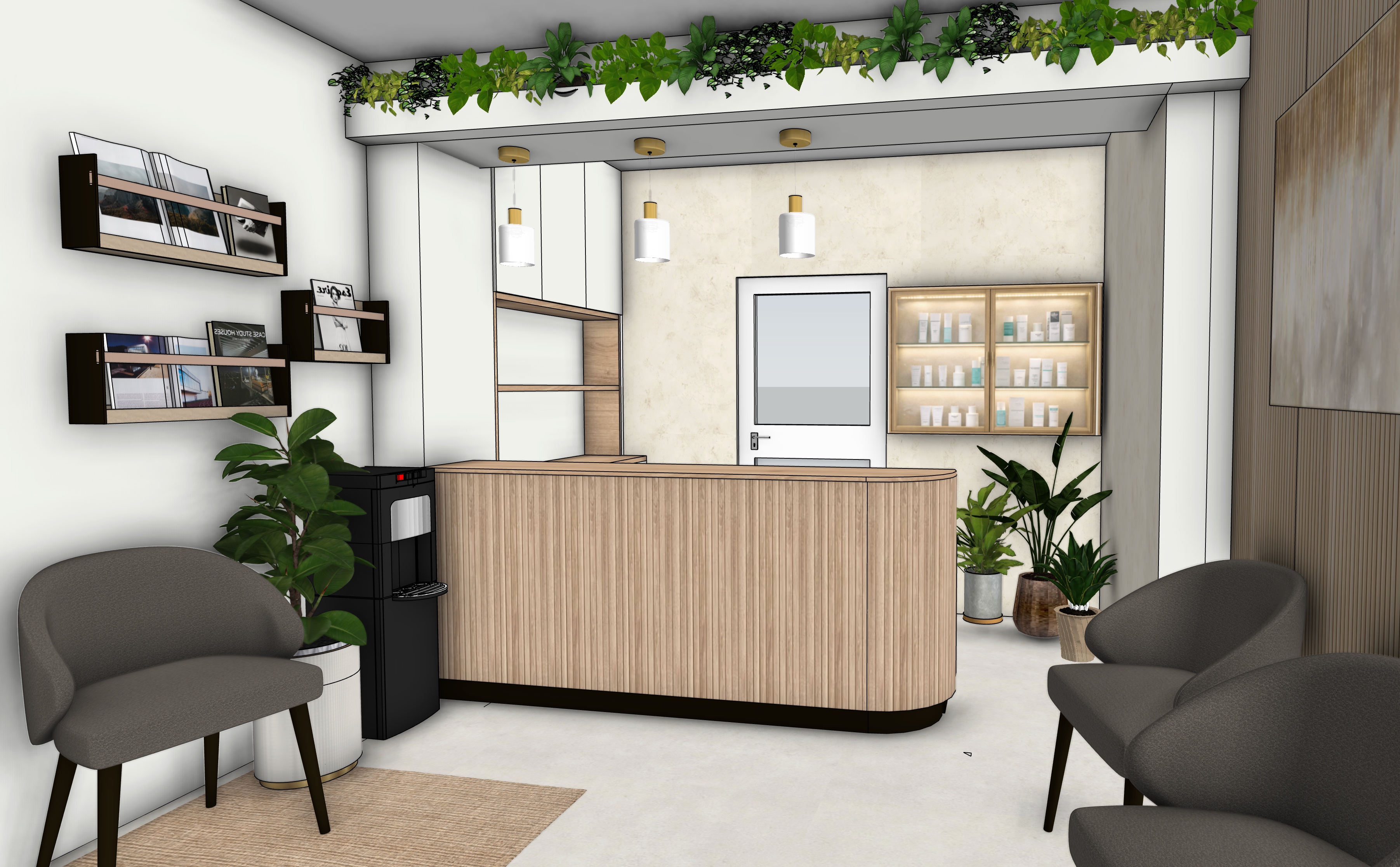 warm inviting waiting room wood finishes and plants pendant lights on warm light led lighting in cabinetry shelving