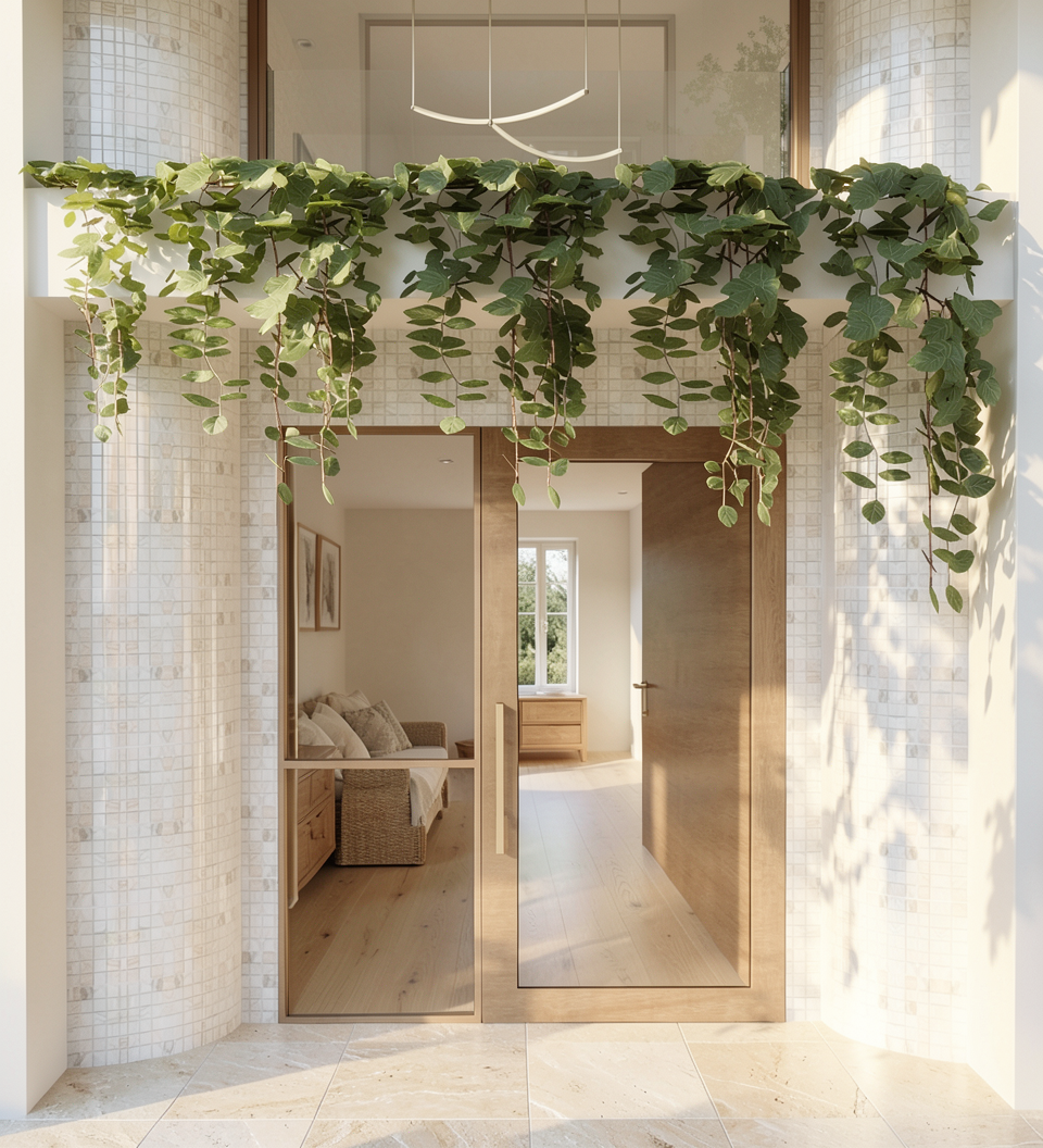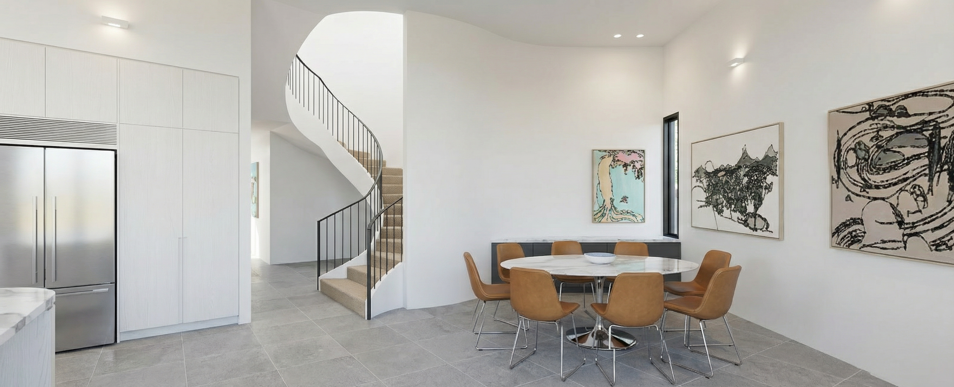 neutral lighting tone modern architectural home open airy ambience with natural light no cornices artwork to look painterly light grey coloured australian bluestone floor tile realistic carrara marble table top realistic carrara marble credenza top medium charcoal coloured credenza cupboards black aluminium window recessed downlights caramel coloured dining chairs with stainless steel legs white american oak timber joinery kitchen cupboards on left hand side beige coloured ribbed carpet on stair white coloured stringer to stair fine steel stair handrail coloured black solid curved wall in front of staircase to be colour white light from large format doors behind camera out of side stainless steel fridge