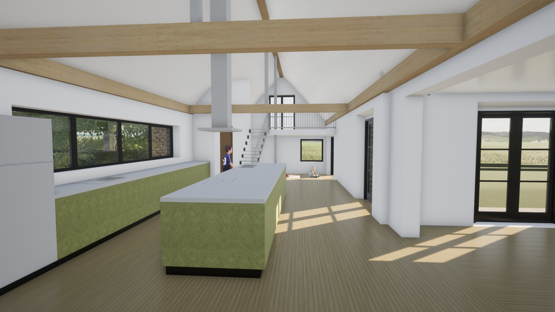 contemporary interior of an open plan kitchen with large marble island unit balcony at back tall vaulted ceiling glulam frame with natural larch finish inset led lighting below afternoon sun wood strip flooring throughout stainless steel cooker hood