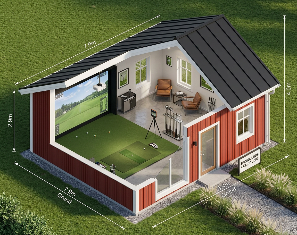 golfsimulator med duk ska vridas s att duken sitter p kortsidan av huset