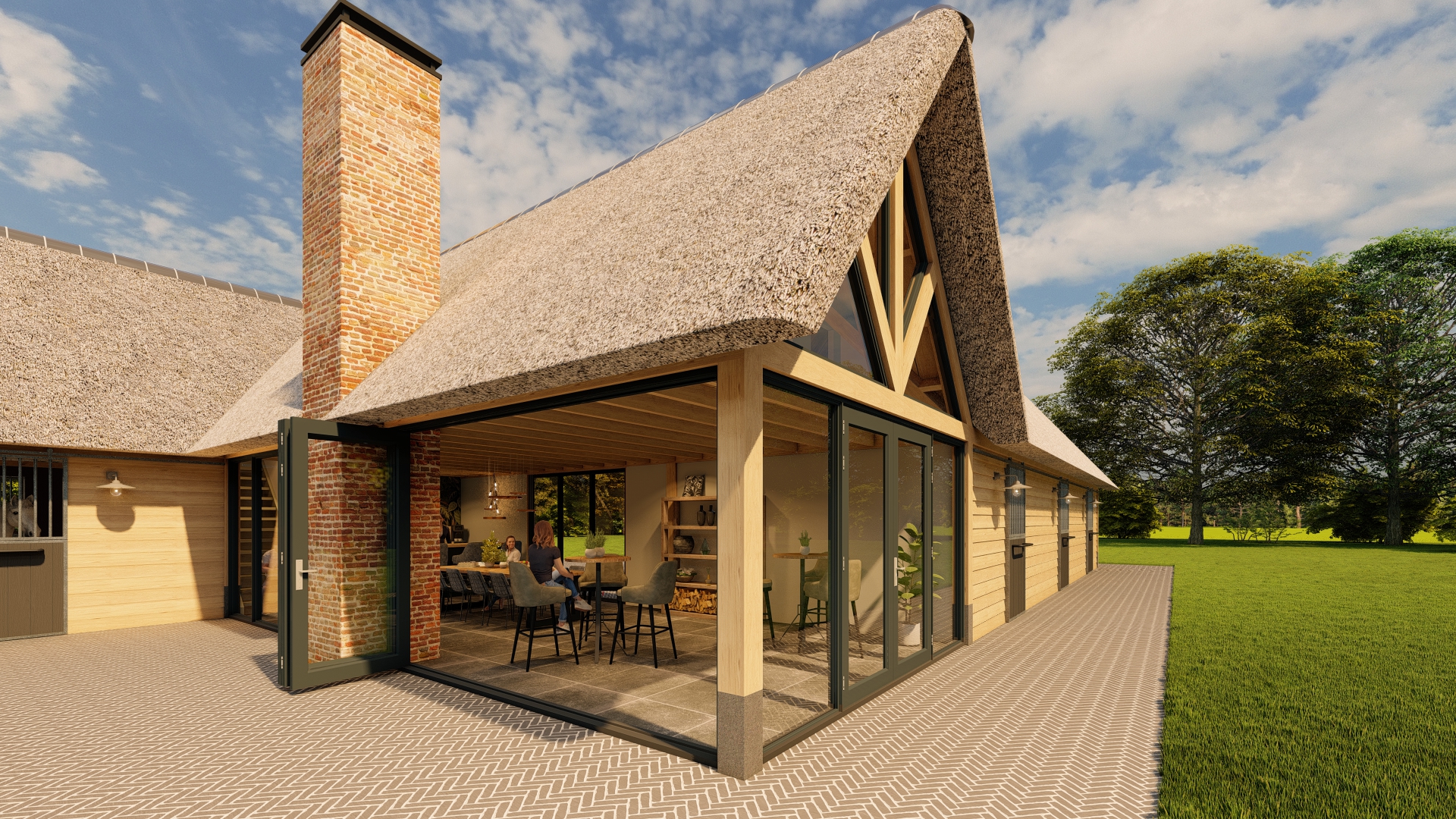 leave everything as it is and only make the thatched roof hyper realistic and add children playing on the grass in the distance horses can be seen