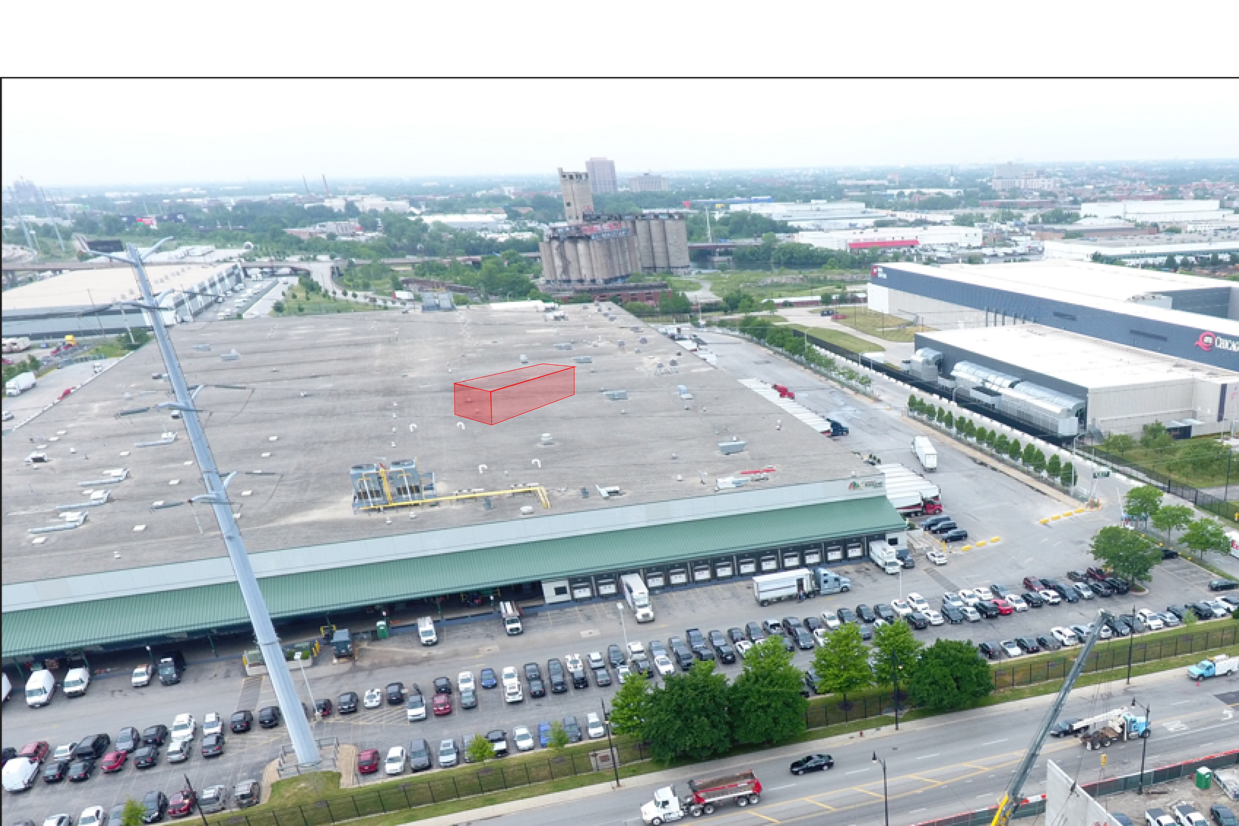take the red square in the middle of this aerial photo and render just it to be a curtain wall 1 story winter garden addition on top of roof at a 45 degree angle from rest of building