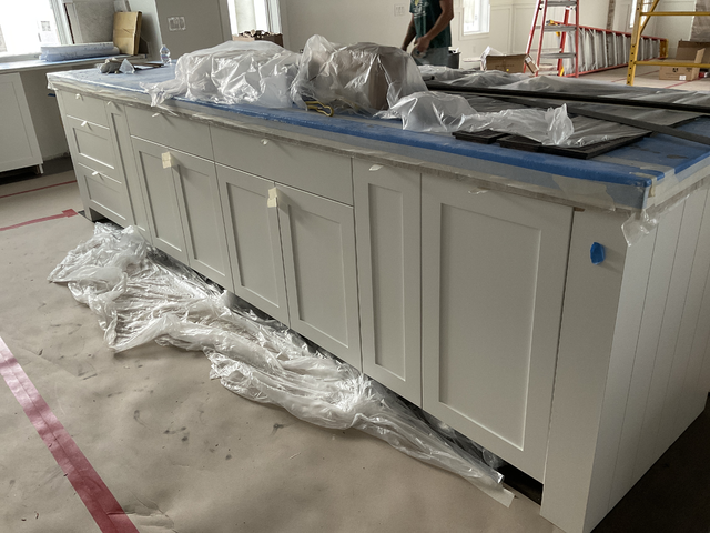 do not change the cabinets in any way preserve the exact cabinet colors materials finishes dimensions door and drawer styles hardware spacing alignment and all geometry exactly as shown do not alter the countertop shape backsplash appliances flooring lighting fixtures or wall structure only remove the construction materials clutter and mess from the scene clean the room and make it look finished and staged add a few simple tasteful home accessories appropriate for the style of the space but do not add or remove any furniture windows or architectural elements maintain the original lighting direction and realism enhance clarity and polish the photo while keeping the cabinetry and room design completely unchanged do not alter the lighting to keep the cabinet colors as they are in the image add flooring add gold cabinet pulls to the door and drawer fronts stage the countertop for a working kitchen island remove the ladders and stage the background as a cozy living room do not change the cabinet lighting or orientation of the image at all