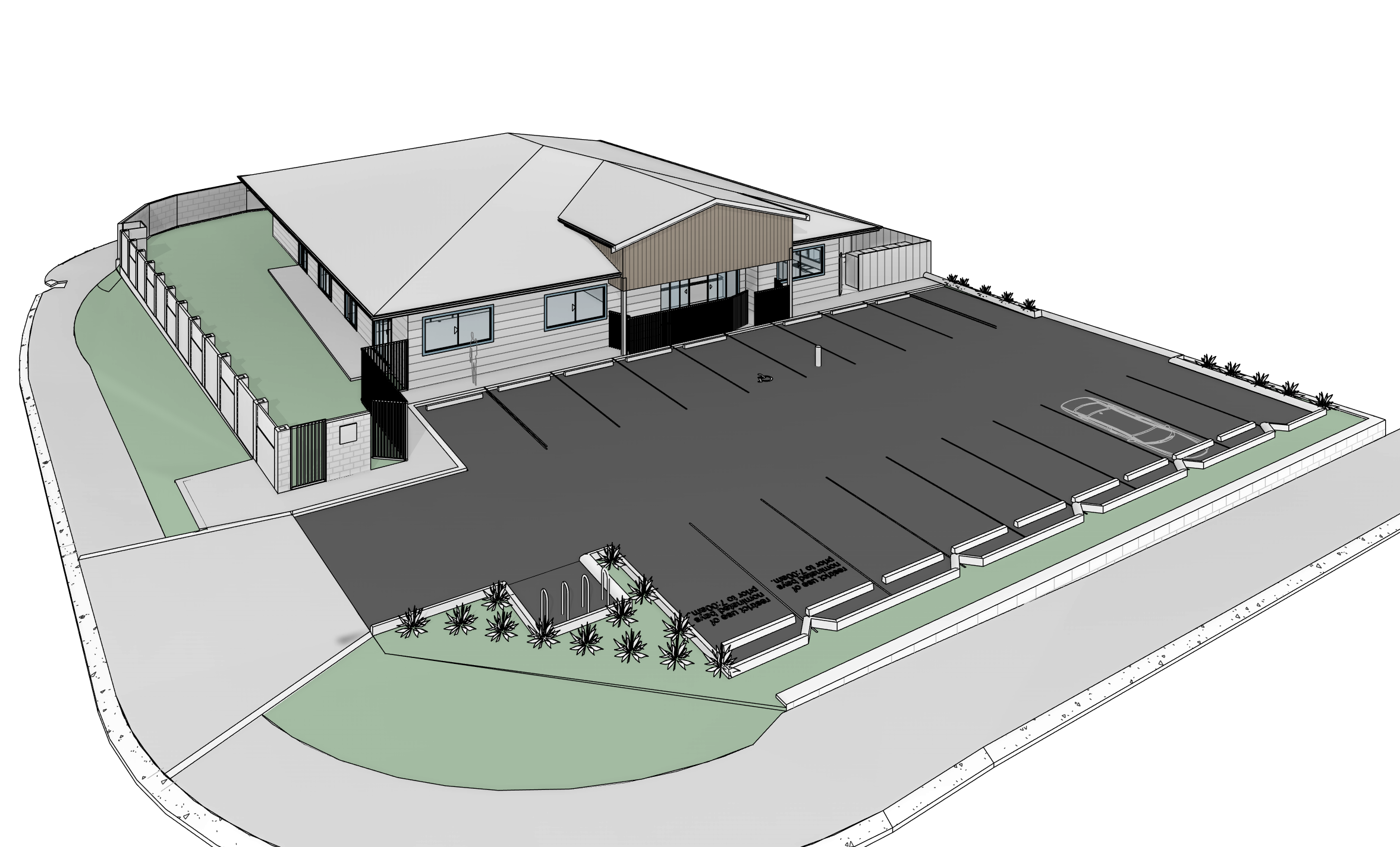 change the parking to bitumen change the vertical cladding to black change the horizontal cladding to white add road around where the grass is and remove the trees at the background