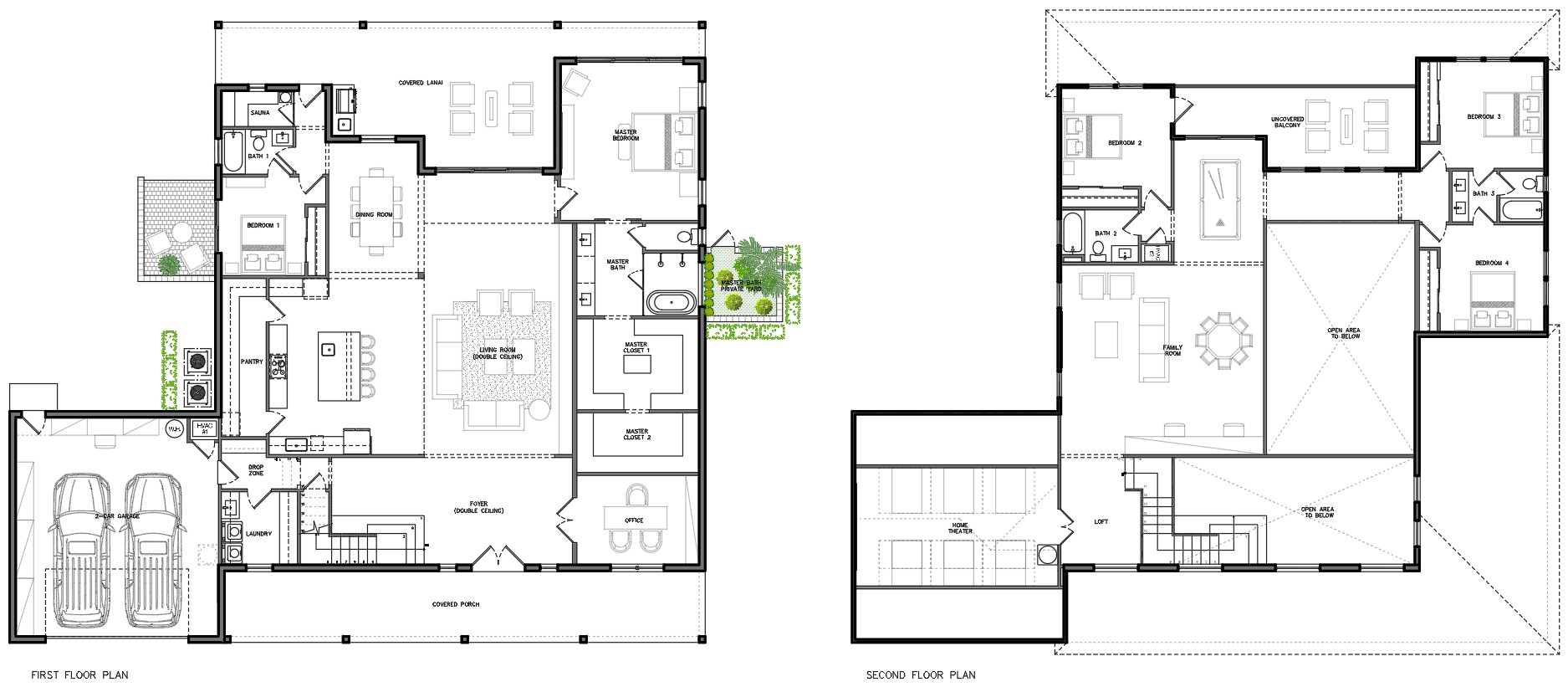 2 story house floor plans on first floor the floor is hardwood white oak everywhere the laundry and bathrooms have a nice light tiles the staircase to the second floor has a nice modern railing the master bathroom double shower has a nice shower glass with a free standing tub inside on the second floor the flooring is also white oak you can see the same staircase at the foyer below in the first floor you can see the living room from the second floor hallway with nice guardrails the home theater seating is facing to west