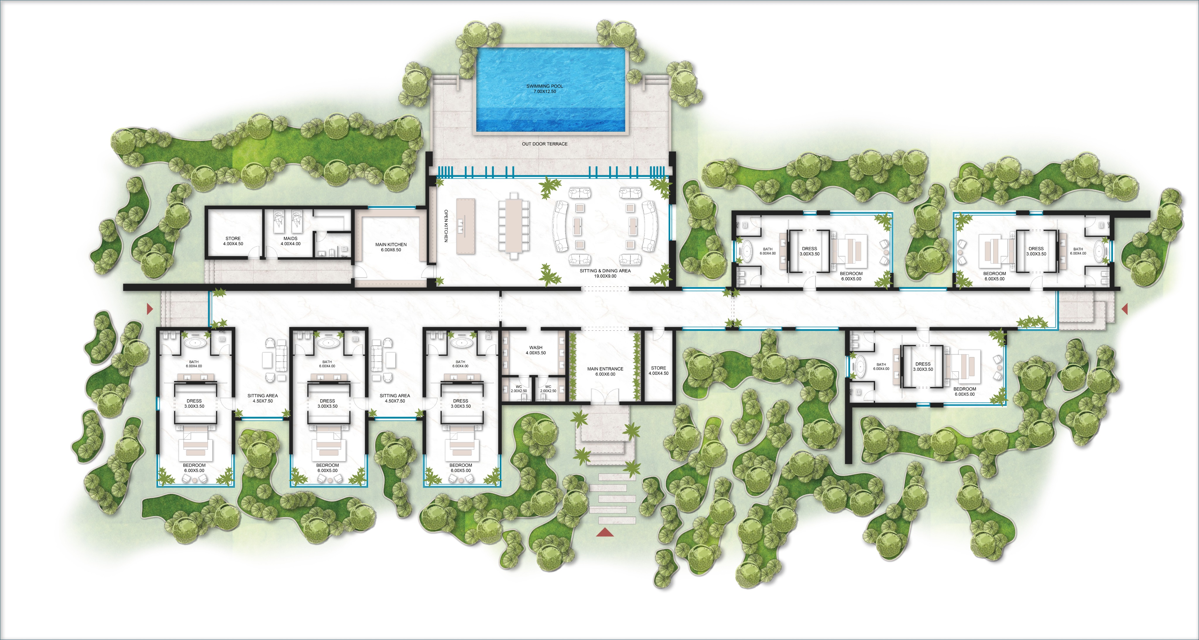 ground floor layout for luxury v vip villa add real effect real furniture real treees floring white marble color wall cut section color black add sun effect and shadow
