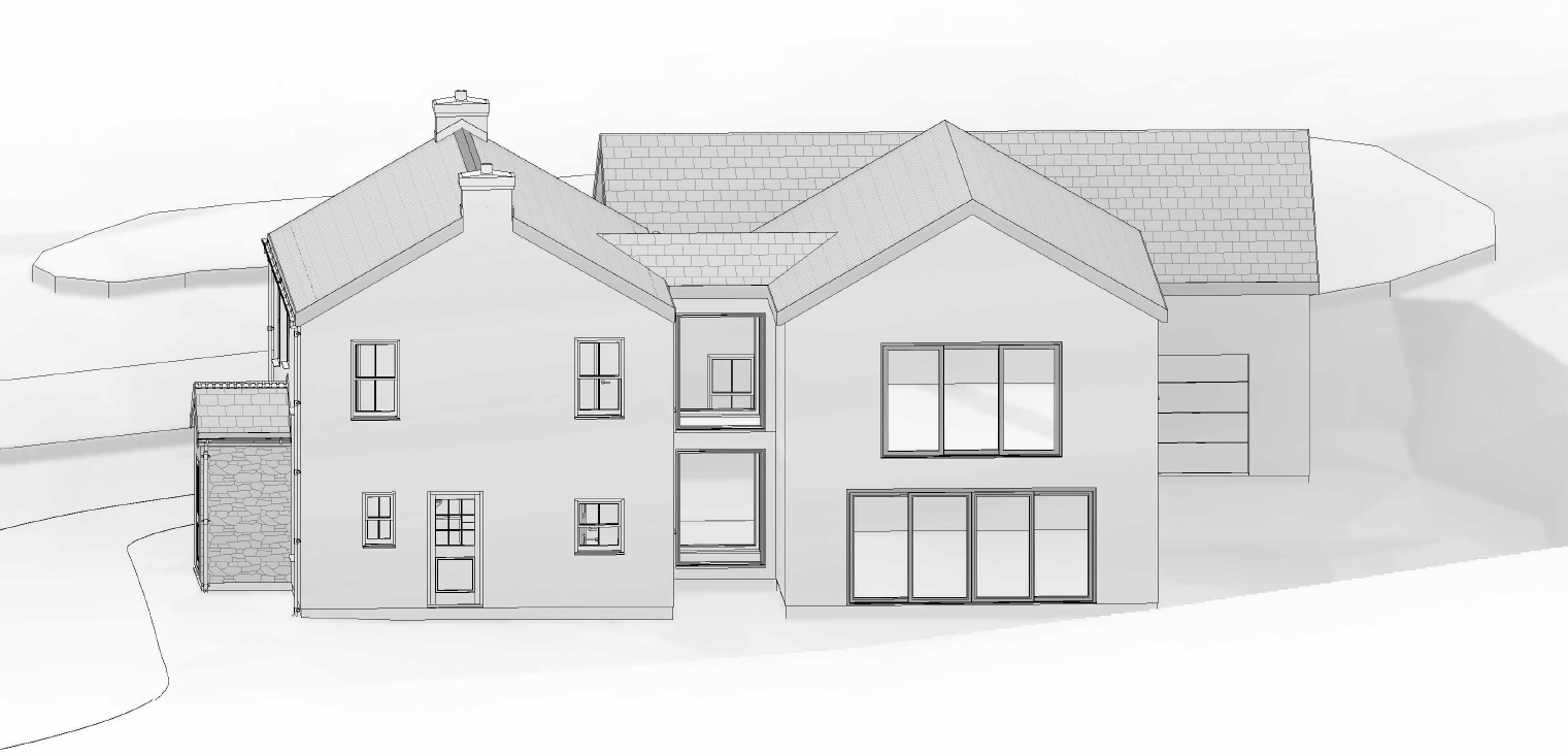 grainy watercolor render of timber frame building with reclaimed wood siding and stone wainscot watercolor trees and urban environment in the background extensive watercolor landscaping surrounding the building