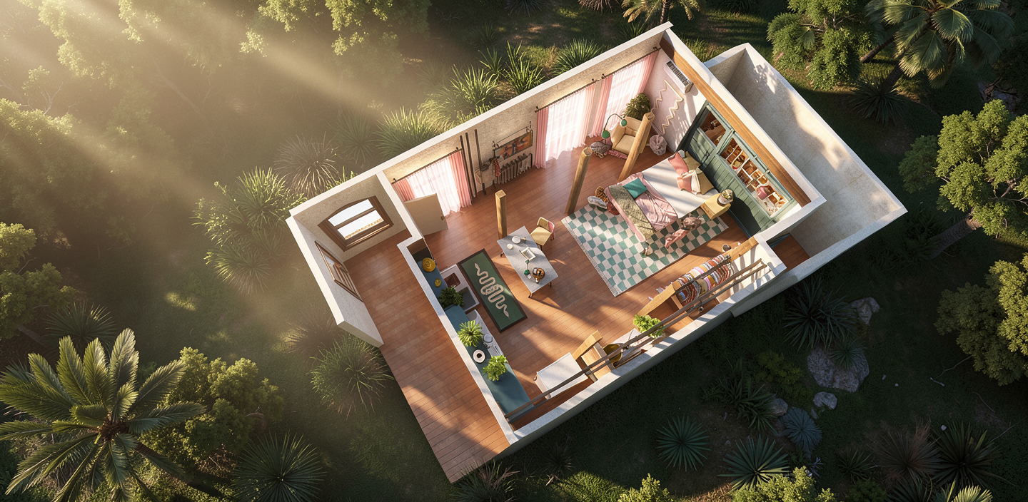 make this a photorealistic scene add some people trees and bushes the weather is sunny with a few clouds the grey parts in facade are zinc with vertical lines there are parking places on ground level the baluster on top level is made of glass keep original viewpoint no glass baluster on rooftop there is water instead of a roadway in the foreground