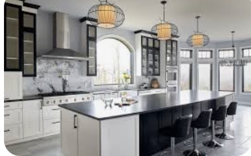 exterior shot black and white tile in kitchen with black cabinets and a stone that will match instead of the bay window replace with sliding doors