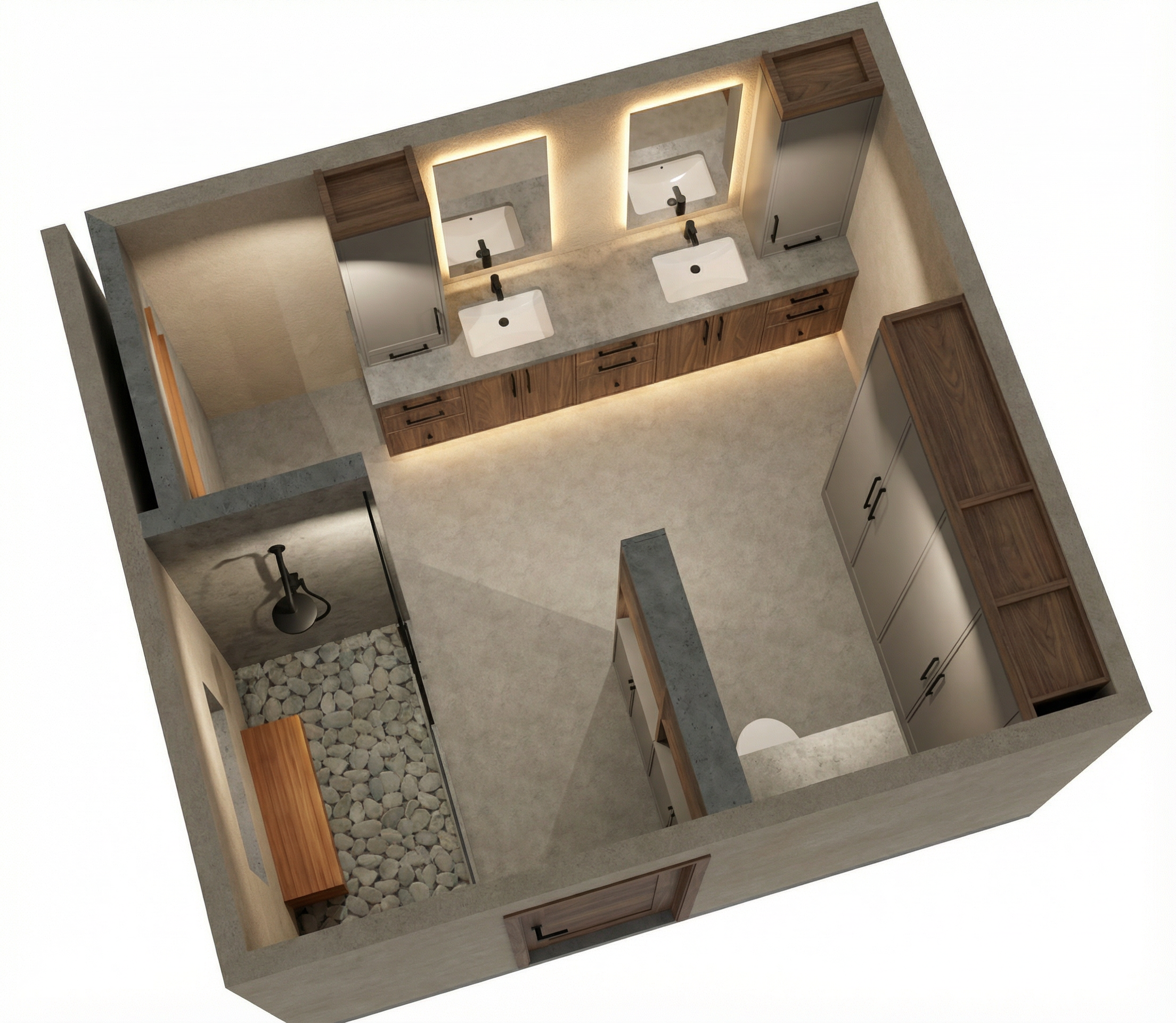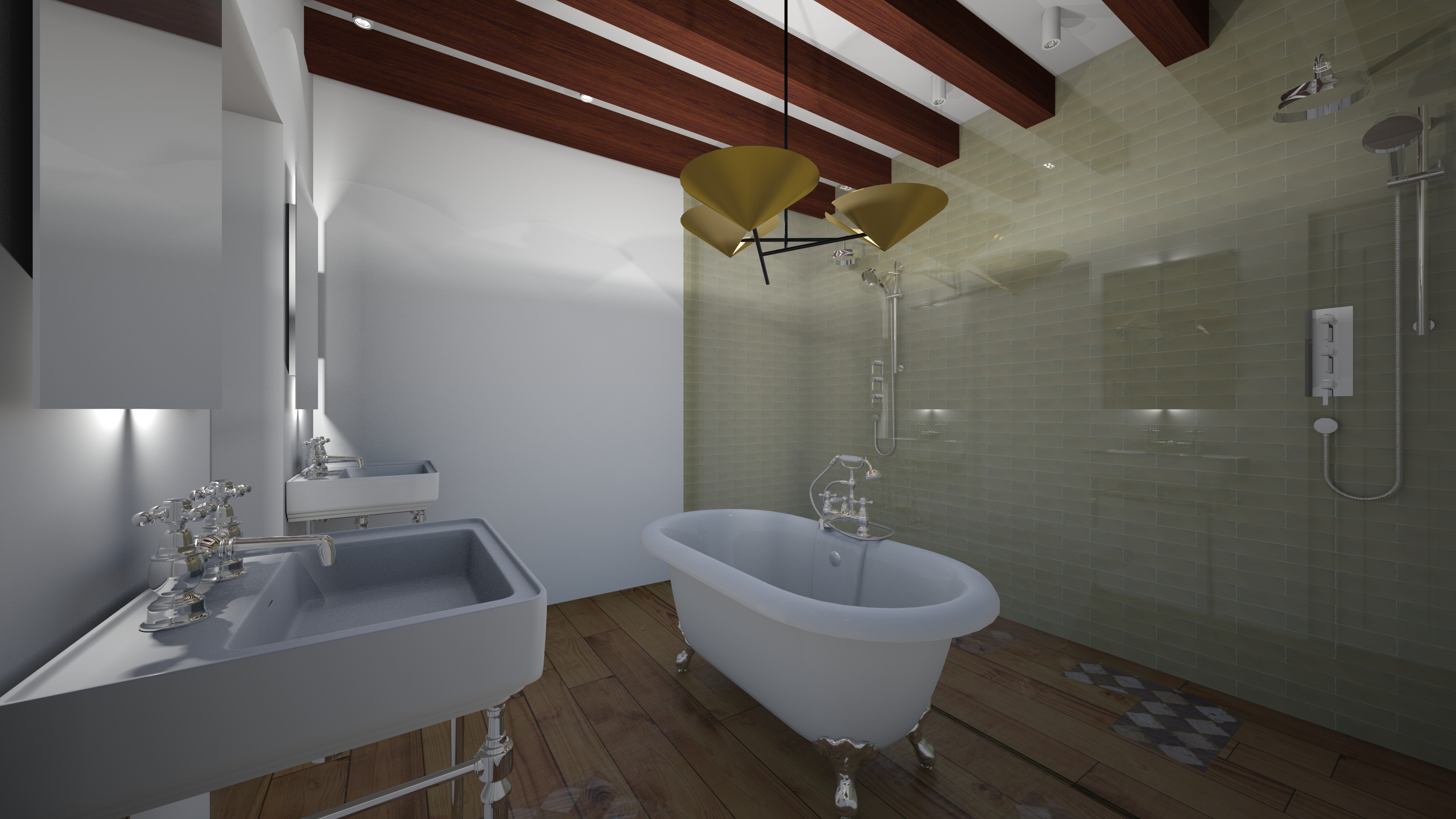 10 x 12 bathroom attached is the concept image the floor is calcutta viola in a 12 in x 12 in format install on an angle the shower walls are covered in a hunter green zelige tile the shower is a steam shower with a built in bench located right behind the tub on the other side facing into shower also covered in tile the sinks are porceline pedistal sinks the mirrors are back lit there are exposed beams stained dark brown and there is crown mounding that runs around the celing with a led strip there is a toe kick that runs around the room with a led light the lighting should look moody the gold on the chandelier is actually belgian linen shade add a two way firepalce on the farthest wall between the sink and the tile