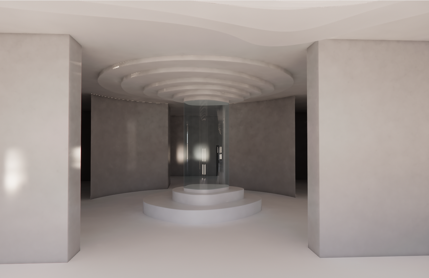 render realistic this is a recreational area for autistic teens inspired by the ocean the center piece is a fountain that water comes down from the ceiling place organic materials and seating around the fountain