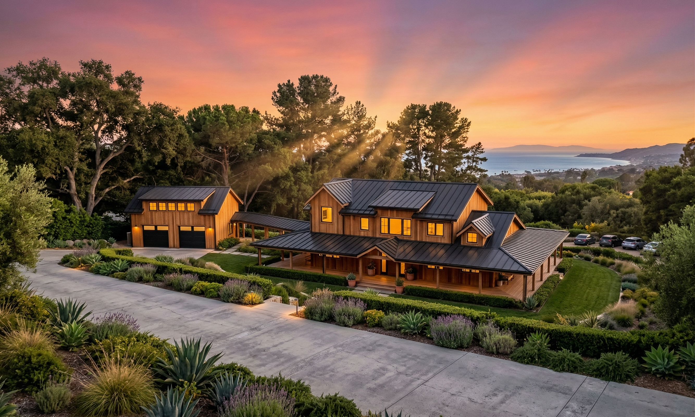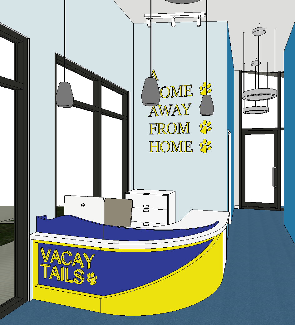 blue pendants over the desk black pendants in the hallway blue speckle vinyl flooring make outside a parking lot with west coast pine trees add a receptionist