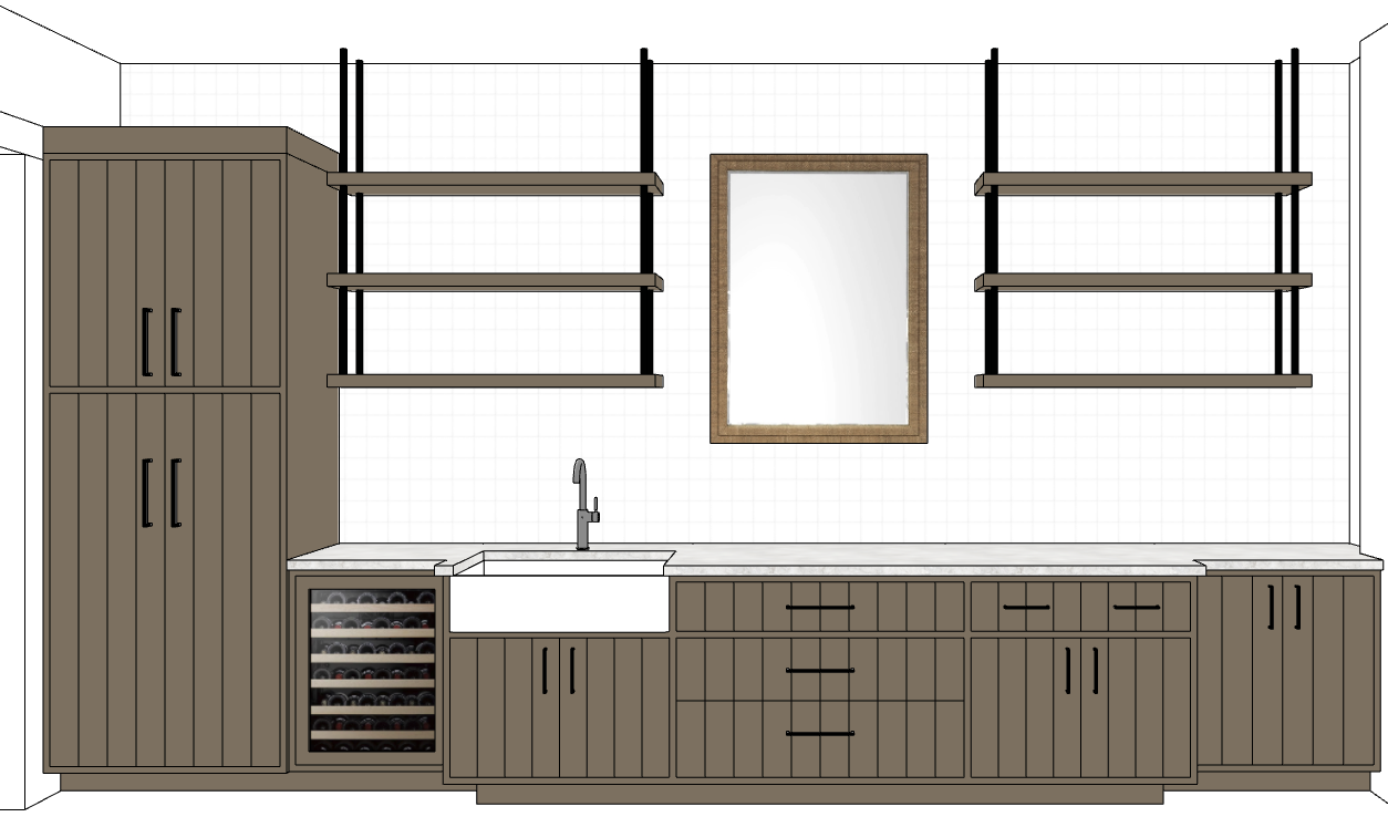built in cabinetry in a covered area in a backyard the cabinetry and shelves are painted a cool toned brown the countertop is a matte white with very subtle grey veining almost like carrara marble the cabinetry hardware is matte black the farmhouse sink is porcelain white with a chrome faucet the entire wall is tiled with 4 x 4 white ceramic handmade tiles in the center is a mirror with double frame wrapped with a woven texture the scene is set outdoor but has no overhead lighting the light source is coming from the right and front the lighting should be bright and airy shining the light perfectly to present the color of the cabinetry