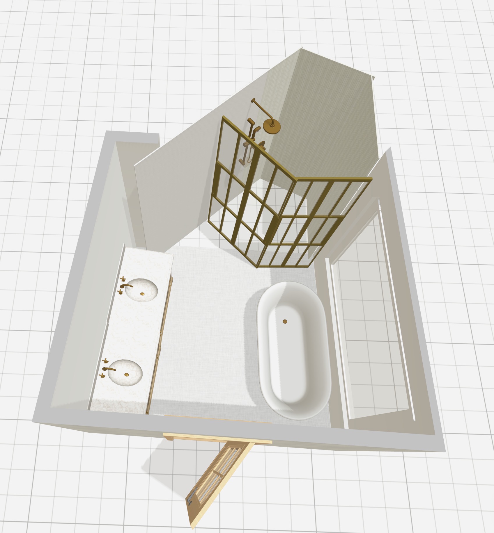 create 3d rendering using the exact floor plan attached and create video showing a person walking through the door to the shower