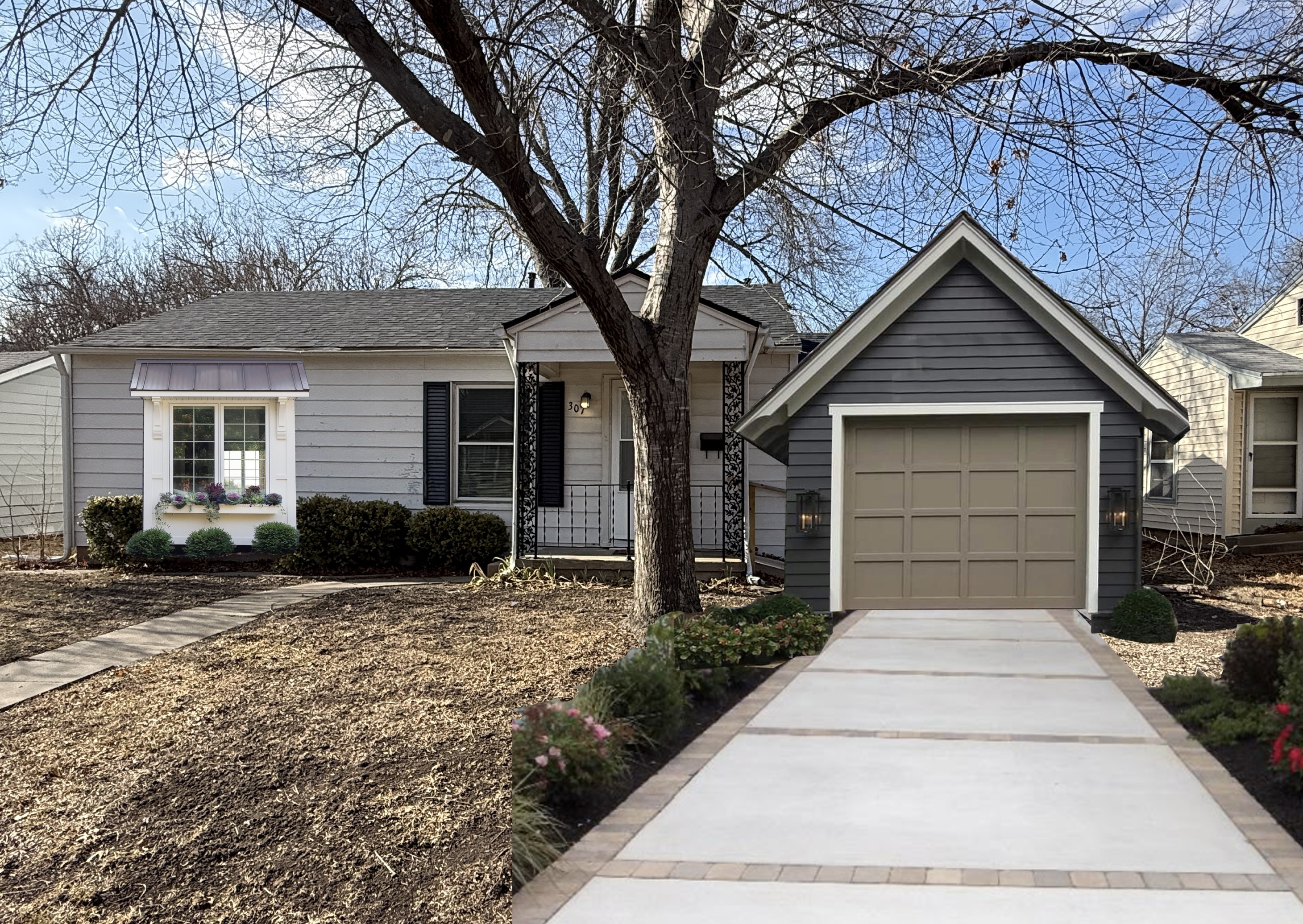 make the regular siding darker green change post on front porch to cedar post and nice green grass wood garage door siding over front door to match darker green siding color add copper roof over bay window copper gutters siding over front door to match darker green siding color