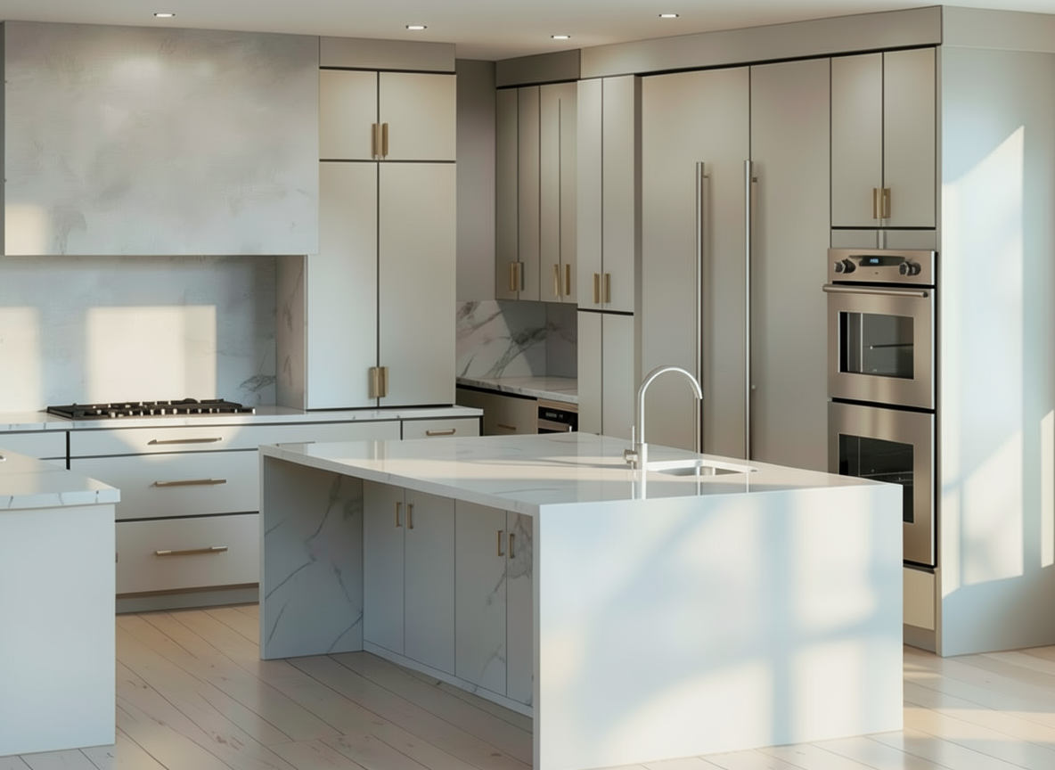 make this into a photo realistic rendering make the cabinets under the island look realistic with real headwear in satin nickel and cabinet colors to match the rest of the kitchen like the rest kitchen keep everything the same material and color