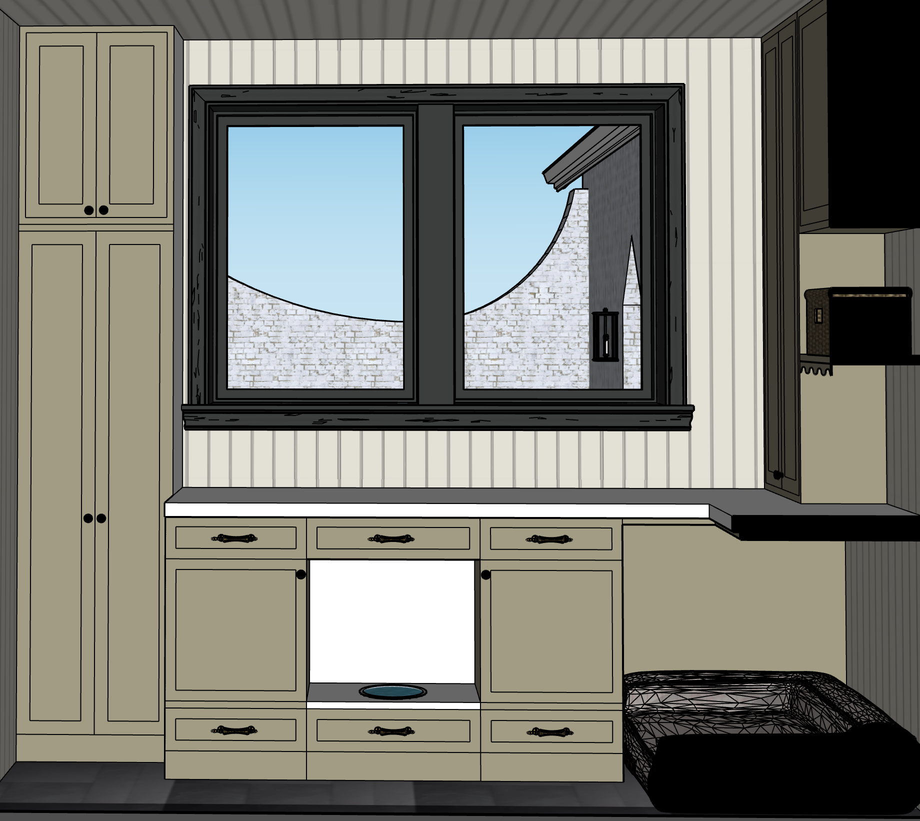 accurate colors and textures good lighting this mudroom has a small water bowl in the middle under the cabinet dog bed are under the cabinets to the right for a black lab window has black window trim no sink