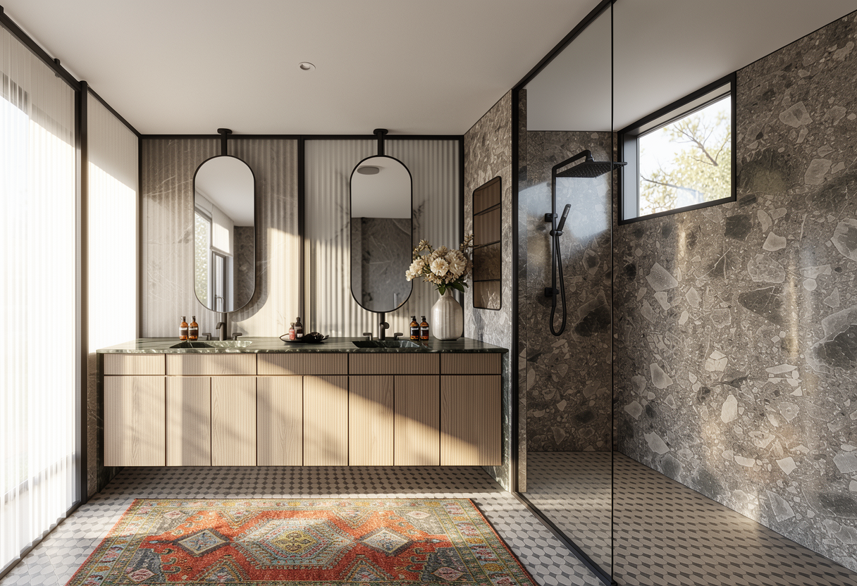 render a highly detailed interior elevation of the provided space important do not alter the architectural layout wall placements ceiling heights door window locations millwork dimensions spatial configuration or proportions in any way do not move remove resize replace or reposition any furniture keep the exact existing furniture layout and arrangement only elevate the interior by upgrading materials finishes textures lighting and detailing while maintaining all original placements elevate the interior to reflect the warm desert modern aesthetic inspired by hinar desert bar cafe featuring organic textures earthy tonal palette sculptural minimalism and refined desert luxury incorporate limewash or microcement walls in warm sand or soft clay tones natural wood finishes light oak or walnut textured plaster details warm brass or aged bronze accents built in niches with soft integrated lighting layered warm lighting 2700k 3000k subtle middle eastern inspired geometry in detailing minimal and refined stone or travertine elements organic shapes and softly curved transitions decorative only not structural handmade ceramic or artisanal details elevate existing furniture only through refined upholstery boucl linen warm leather upgraded finishes and textural layering while keeping every piece in its original position lighting should feel intimate moody and ambient with soft shadow play render as a straight on architectural interior elevation orthographic view highly realistic materials ultra detailed textures soft natural lighting photorealistic 4k resolution