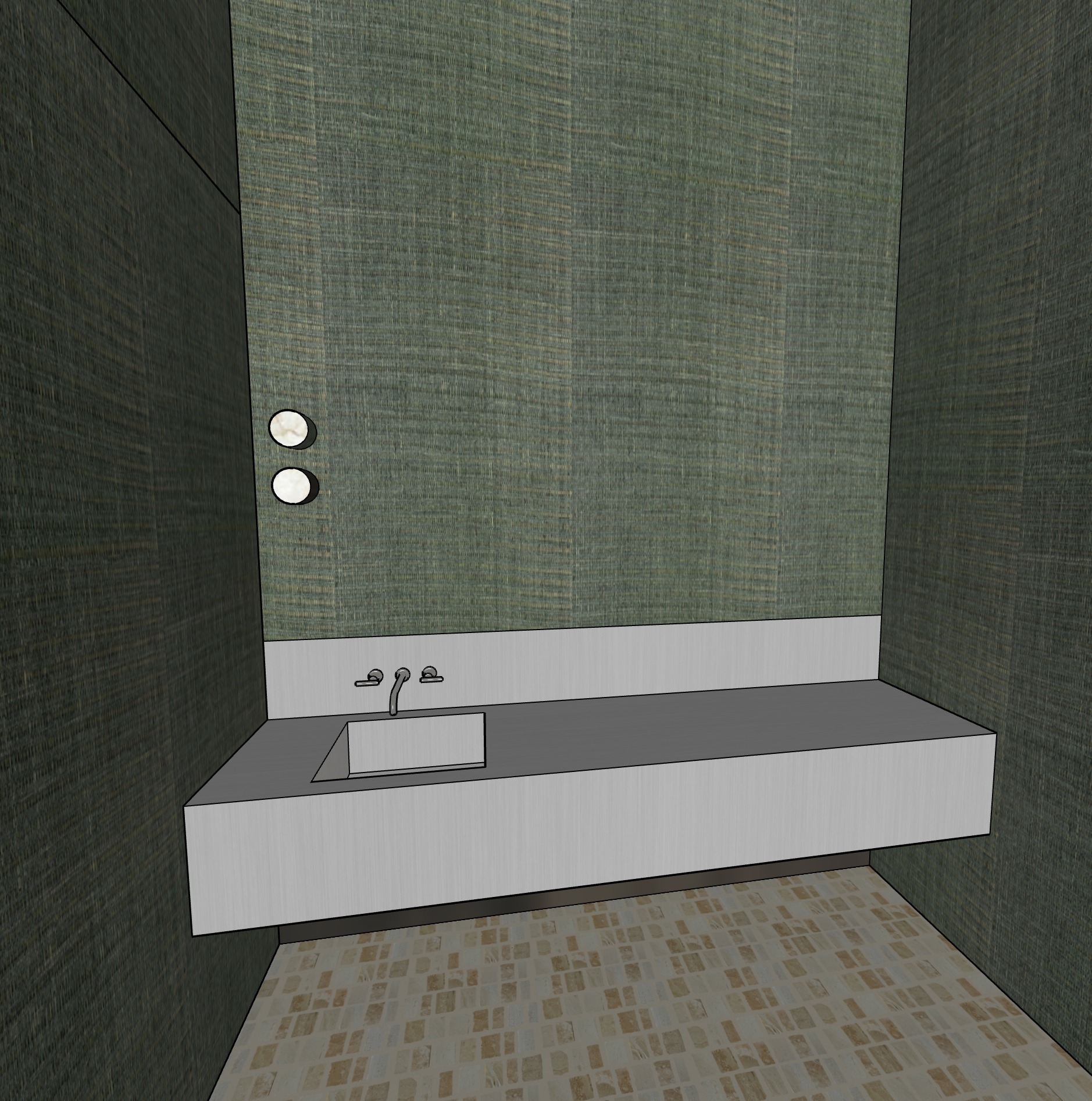 small and moody powder room with dark green grasscloth wallpaper as shown floating stainless steel vanity with integrated sink and backsplash as brush nickel wall mount faucet as shown scarpa mosiac floor tile small circle sconces