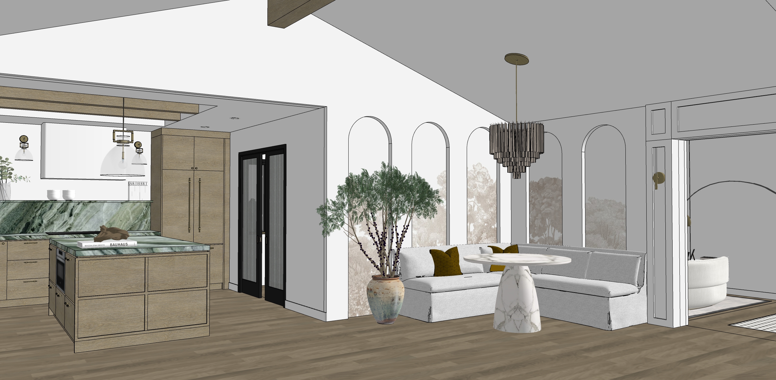 create a render in hyper realistic architectural visualization quality 8k resolution all objects furniture sanitary ware and architectural features must remain in place do not add any objects or delete anything from the image the spatial configuration must remain unchanged warmth gentle reflections soft shadows enhanced color richness and luxurious level realism improve depth and realism through wood grain richness brass highlights fabric texture and polished clarity while keeping the entire scene exactly as originally designed use general daylight lighting in the room but not too bright use a smooth white wall surface above the tiles the wall covering should be the same light color as the floor covering light is coming from kitchen windows on the left side and the light above the dining table is crystal and have a low light intensity in it floor is wooden laminate and all the wood in the scene to be light oak but not too red or yellow dont make the scene too bright