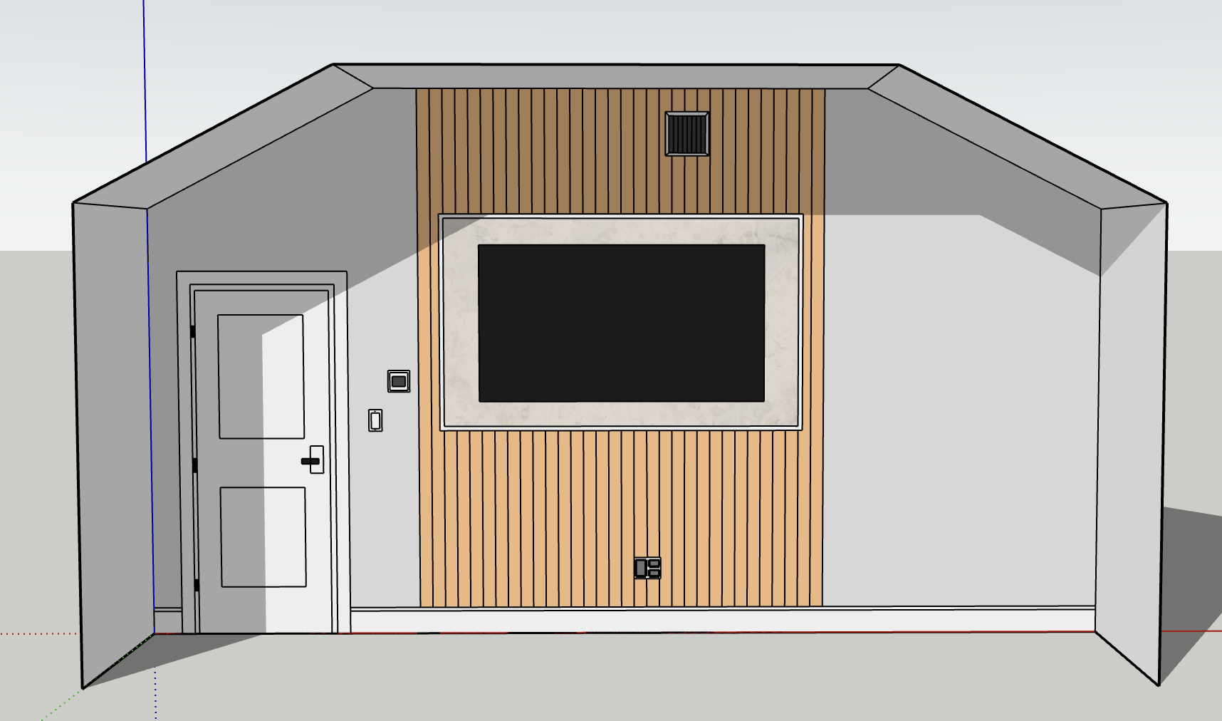 turn this 2d sketch up rending into a realistic photo this is a media wall concept that includes wooden acoustic panels a faux marble background installed behind the tv with warm white led light emitting from behind the marble background an led strip will be added behind the marble backdrop so have the warm light emit evenly behind the marble background