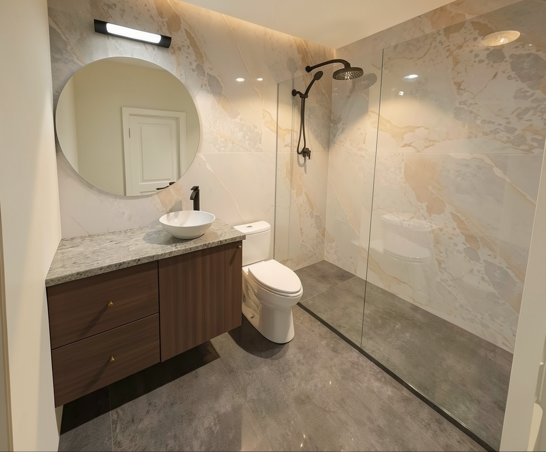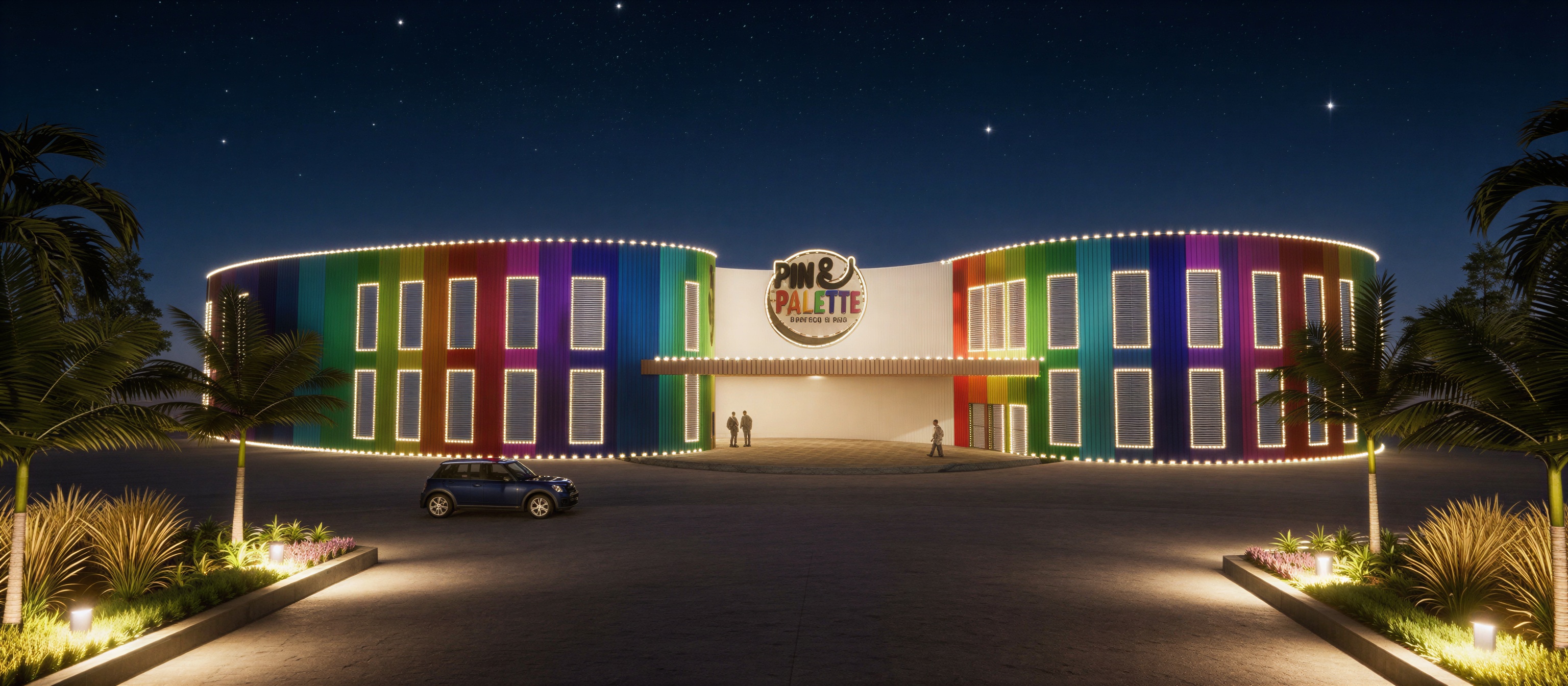 place a 3d mapped projection on the center white area of the building facade do not place the projection on any colored areas or on the building s sign do not change anything else in the image