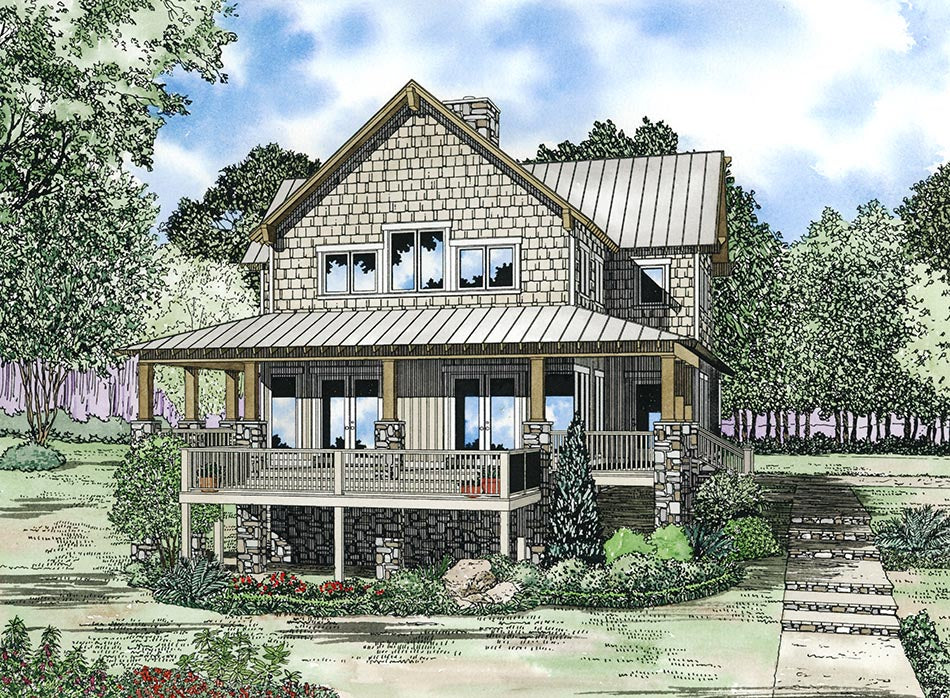 create high resolution photo with plush trees and bushes with vibrant sky keep all details exact as original match existing colors keep same perspective add river running from side to side in background add a firepit and adirondack chairs looking at river on back side of home not on front show mountains in the background