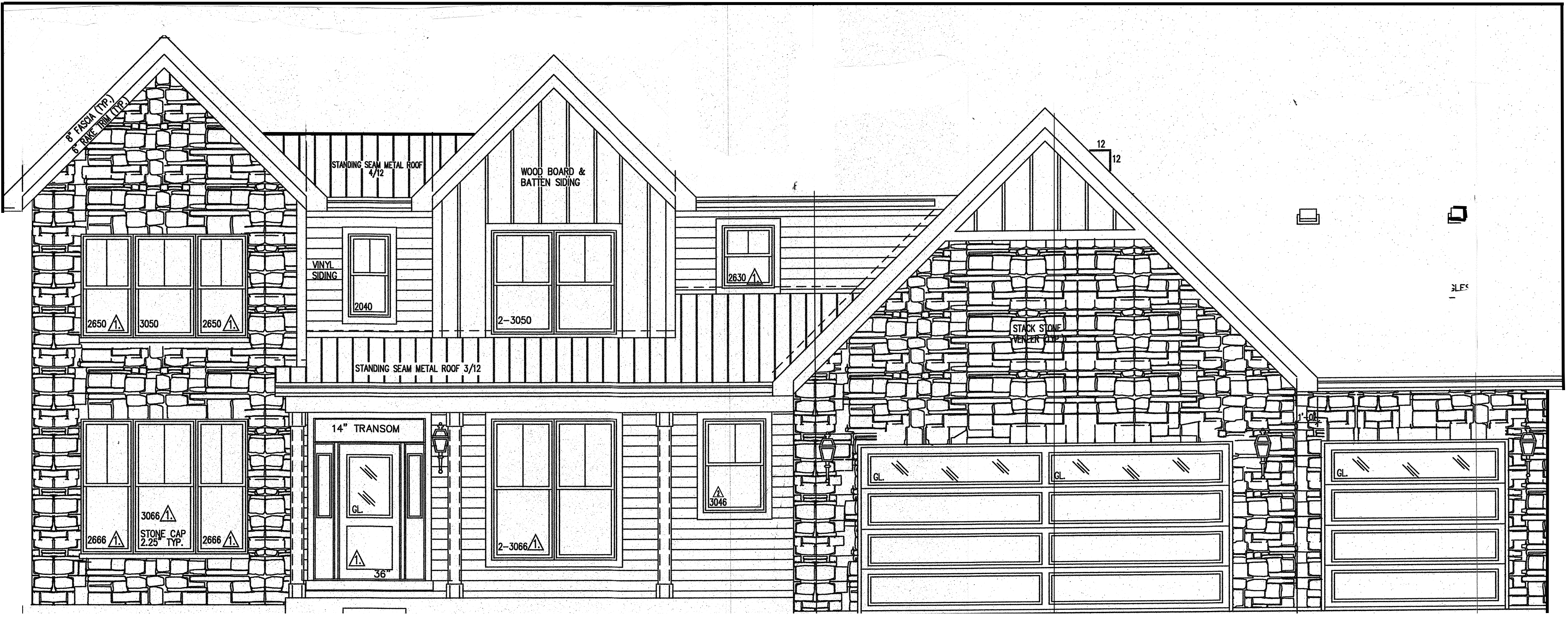 white stone and dark gray garage doors and matching windows and a black shingle roof make the roof above the front door black metal
