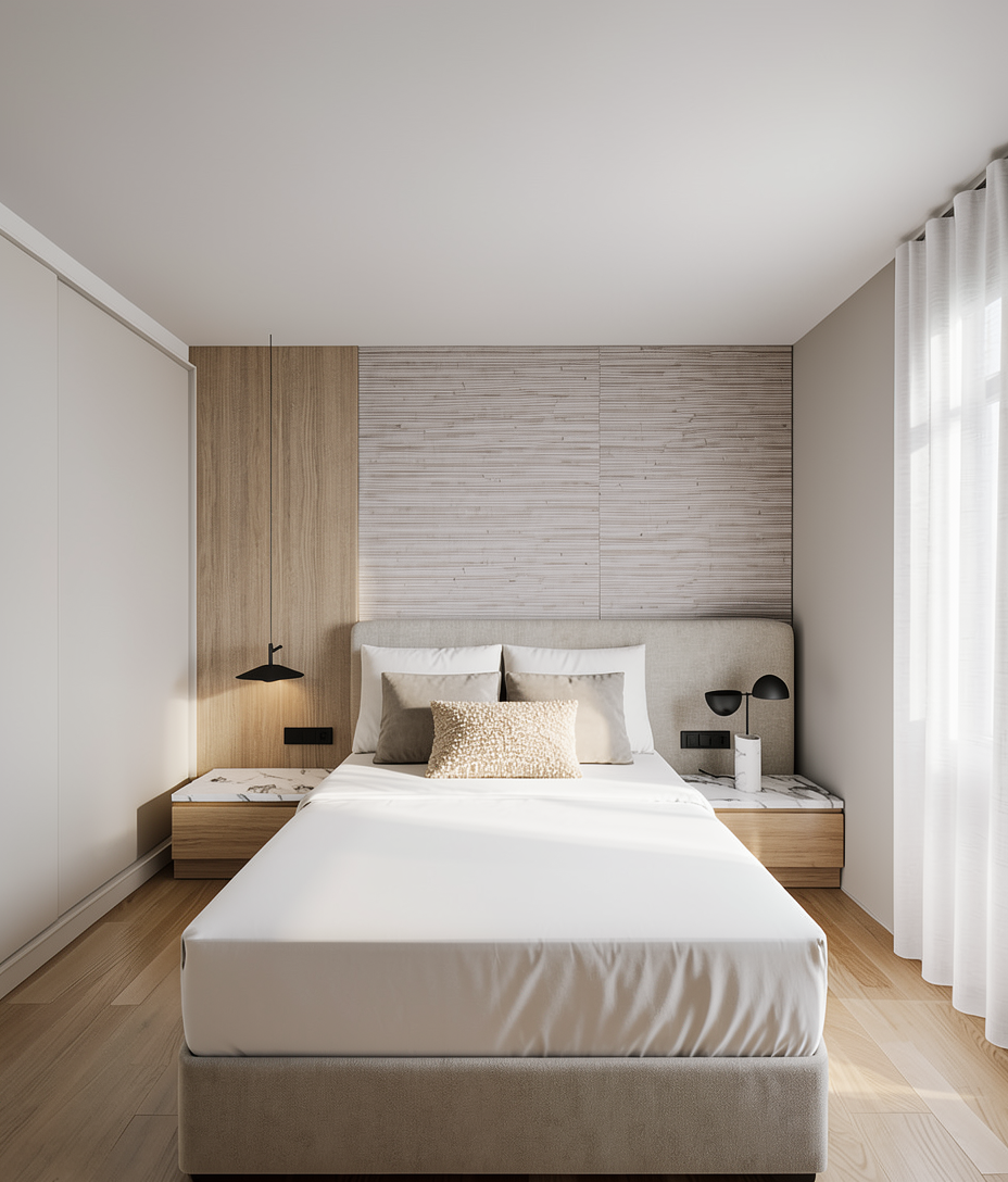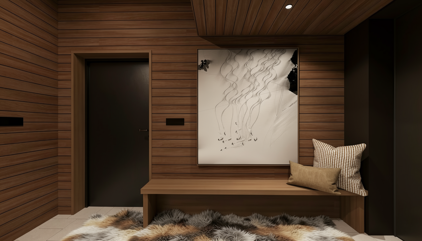 photorealistic architectural render of this exact wooden interior scene keep all elements unchanged dark wood walls and ceiling black door abstract white swirling artwork on wall wooden bench with beige pillow recessed lights light wood floor add only on a small floor fragment directly in front of and slightly under the bench a realistic sheepskin shearling rug exactly like the reference but modified elliptical oval shape about 1 2 meters long and 0 7 meters wide fragment natural sheep wool blending light gray and pale tones with subtle gradient from soft beige gray to warmer light gray long dense shaggy fleece with wavy texture and natural hair strands soft fluffy slightly ruffled edges lying flat soft shadows matching the warm ambient lighting no distortion perfectly blended into the scene without covering the entire floor area high resolution 8k ultra detailed fur texture as in professional product photo