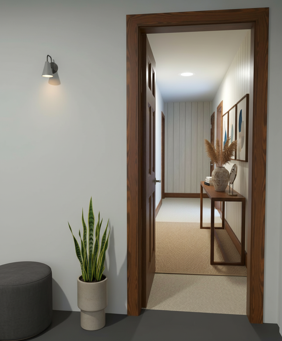 arched wall is recessed from double door wall
