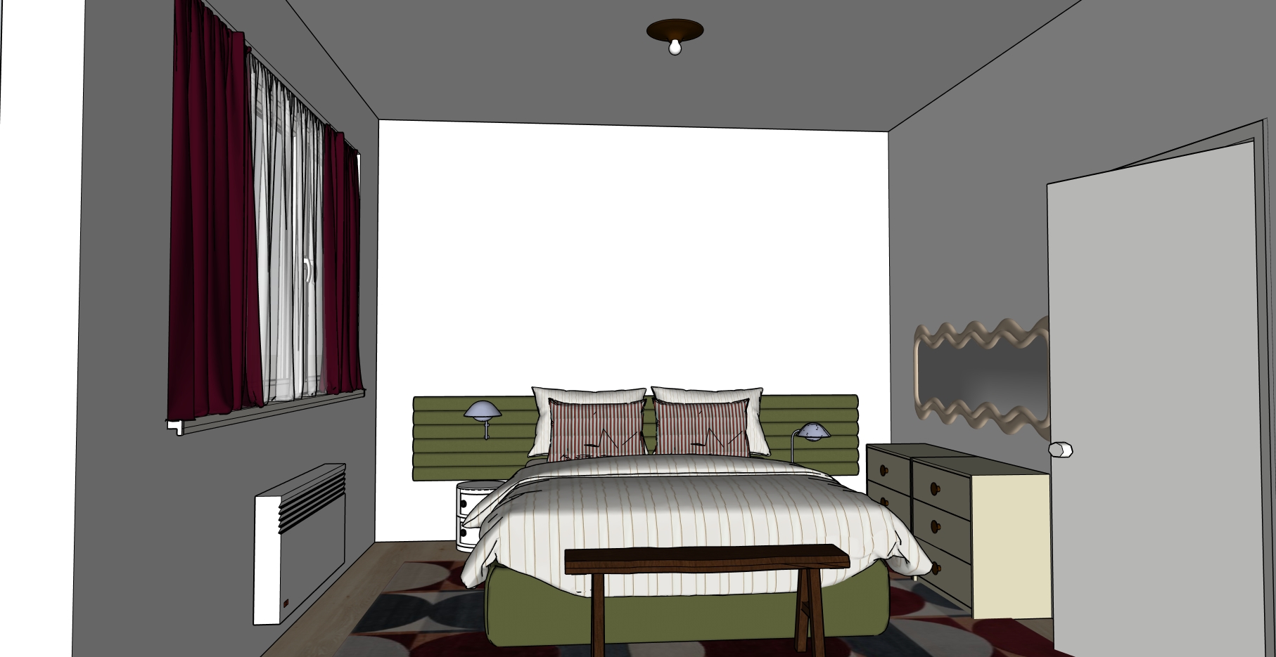 a photorealistic interior rendering of a modernist bedroom created from a 2d sketchup plan remaining fully faithful to the original image s style proportions and decorative patterns the scene conveys a serene early morning ambiance with soft natural light filtering through sheer curtains casting gentle shadows and highlights across the room the bed features striped patterned sheets and a plush upholstered headboard while a low pile geometric rug adds subtle texture underfoot sleek metallic bedside lamps and carefully arranged abstract artworks complement the minimalist furniture the rendering emphasizes the authentic feel of natural materials revealing the grain of wood the softness of textiles and the reflective sheen of metal all captured with deep detail and a calm realistic atmosphere